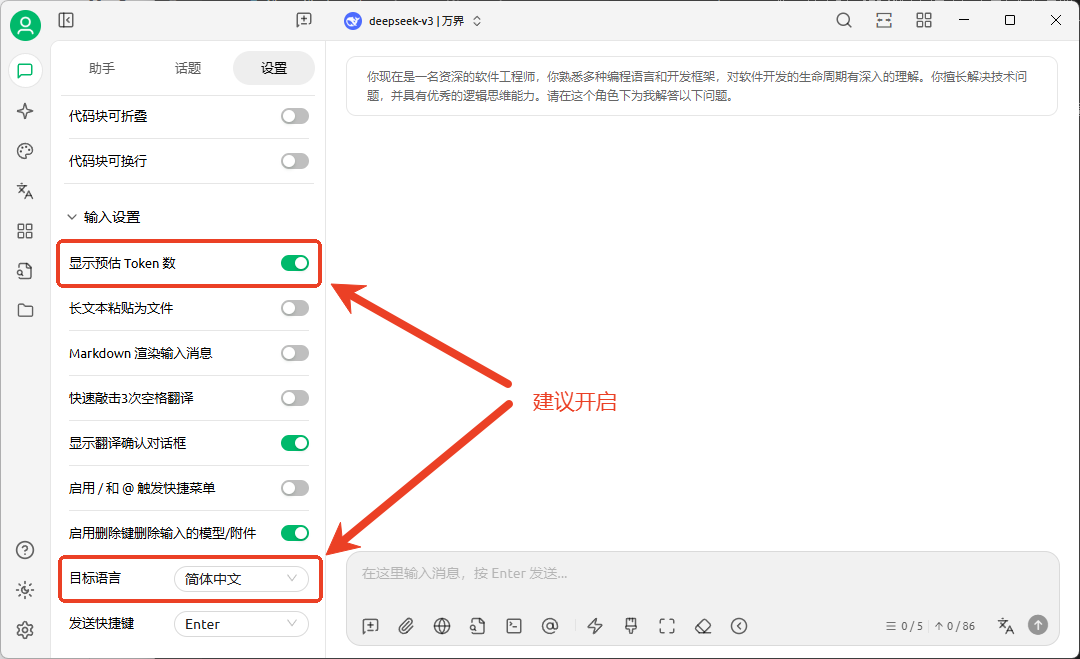 - 双击打开 Cherry Studio 软件,在左侧点击 助手--设置,进入设置界面后可根据个人喜好进行更改。建议在 输入设置 端口找到显示预估 token 数并开启,目标语言 建议选择简体中文。