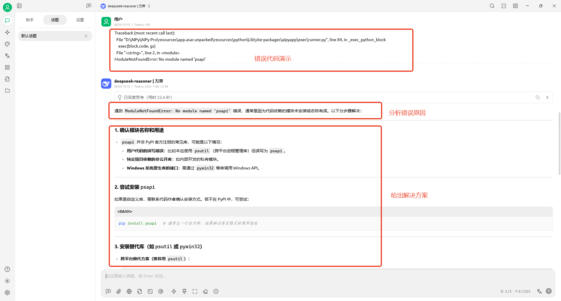 - 除了回答简单问题,Cherry Studio 还可以进行错误编码分析,只需要将有问题的代码或者反馈出来的日志复制粘贴到输入框中发送,cherry studio 会自动进行分析并给出相应的解决方案。