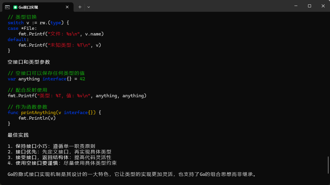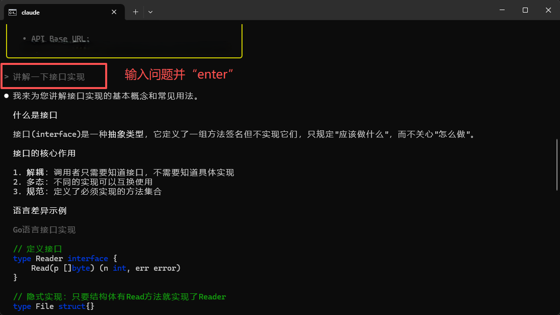 比如我想了解go中接口如何实现,只需要在对话框中输入“讲解一下go语言接口实现”,Claude code 会经过思考、归纳、为我带来详细的接口理论讲解以及应用示例。