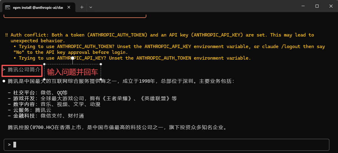 比如我想了解腾讯公司简介,只需要在对话框中输入“腾讯公司简介”并回车,Claude code 会自动搜索出相关的知识,并给出知识内容。