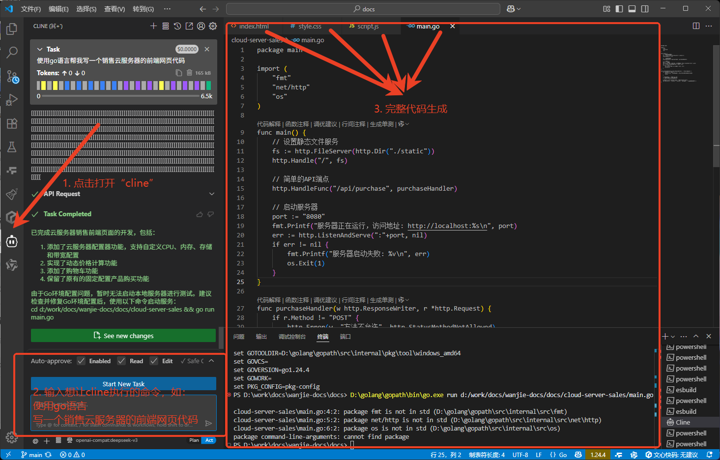 在文本框中输入你想让他执行的任务,cline 通过配置模型算力,智能识别出你输入的语句的含义,并根据要求自动生成代码。
