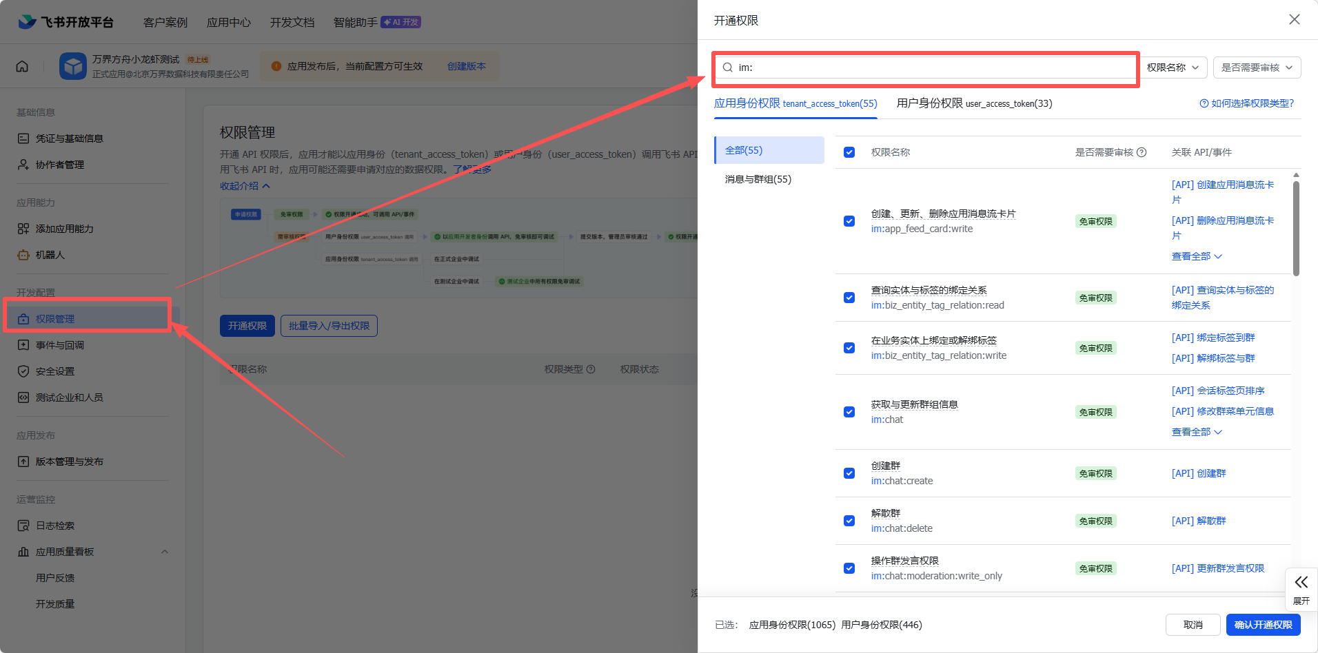 创建完成后,点击权限管理,打开开通权限并在搜索栏输入im:,开启所有所有权限并保存