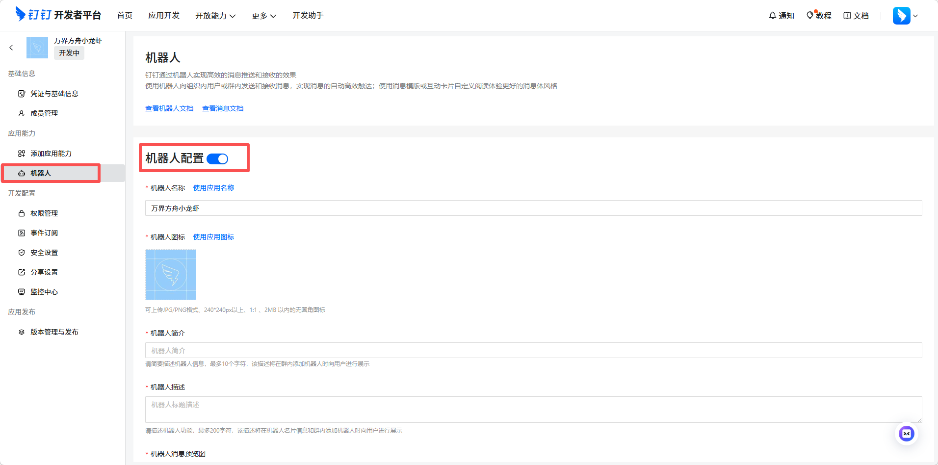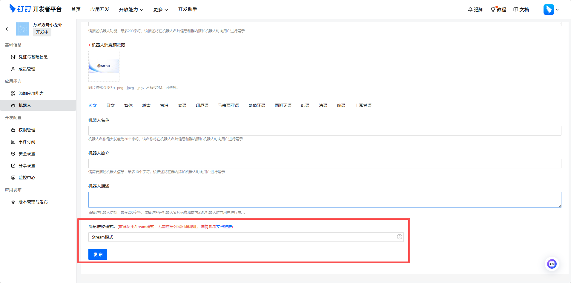 在机器人配置页面,打开机器人配置开关,可以参考页面提示完成配置。消息接收模式请选择 Stream 模式,然后单击发布