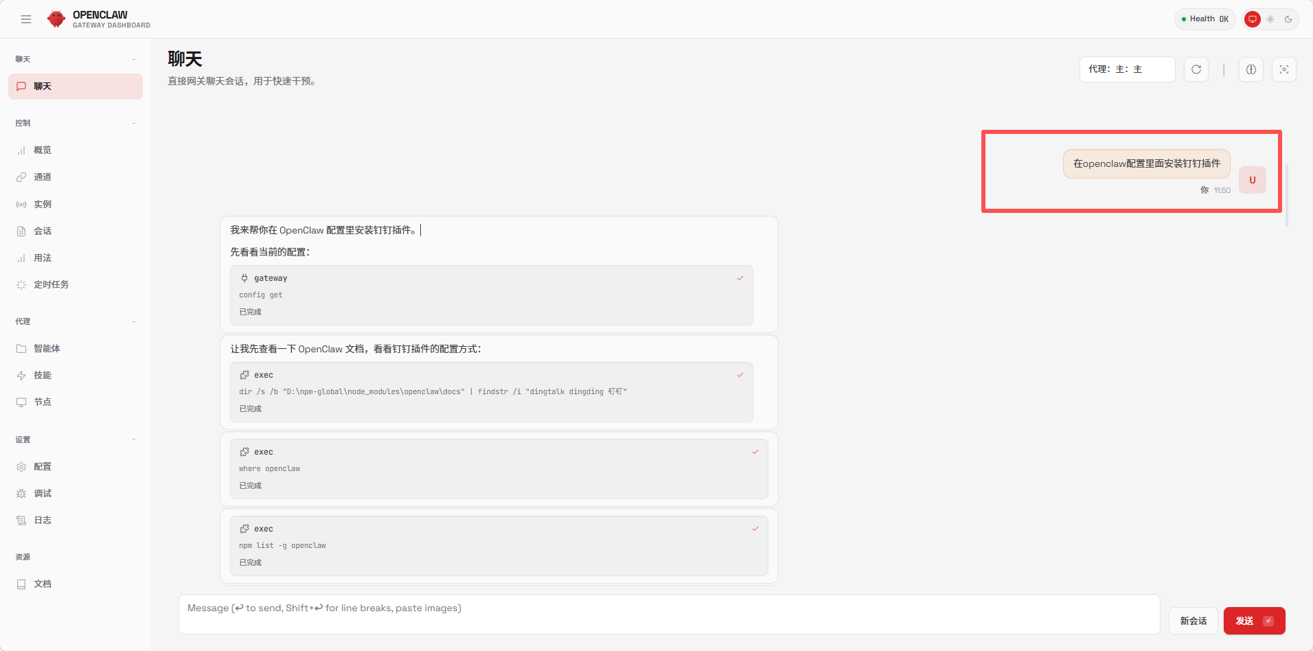 OpenClaw 默认没有钉钉插件,我们选择让 OpenClaw 自动安装钉钉插件,聊天界面输入在OpenClaw配置里面安装钉钉插件