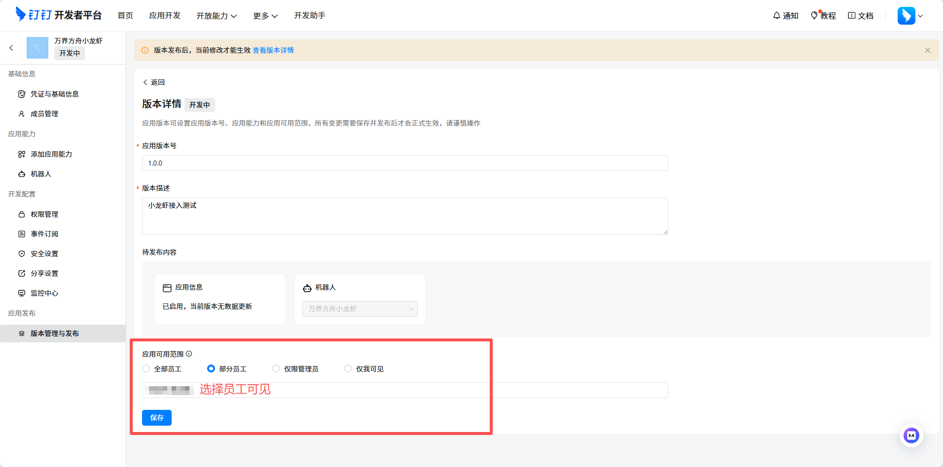 进入版本详情页面,输入应用版本号和版本描述信息,选择合适的应用可见范围,完成后点击保存。并在弹窗中点击确认发布。
