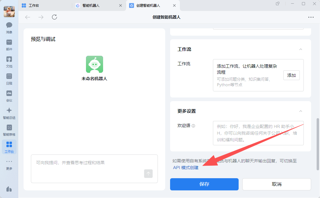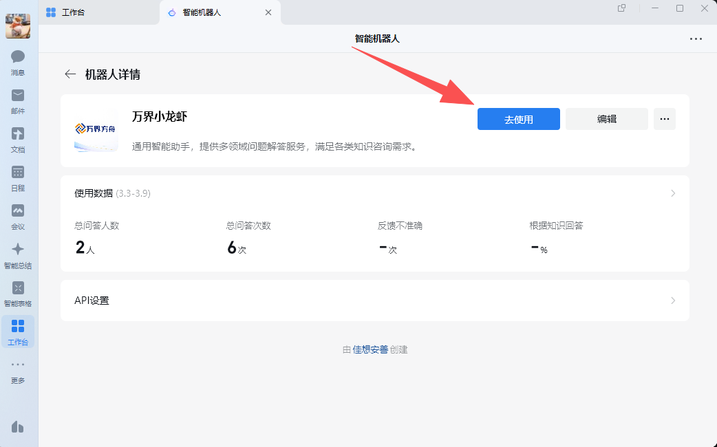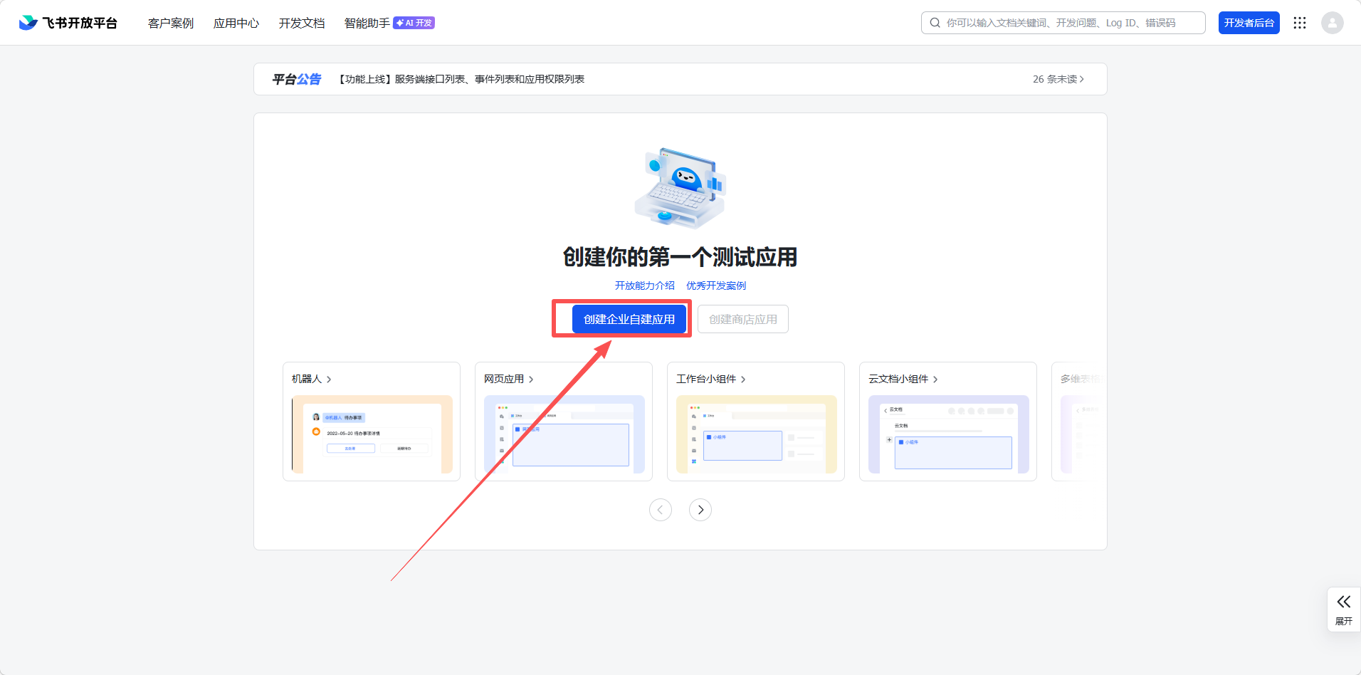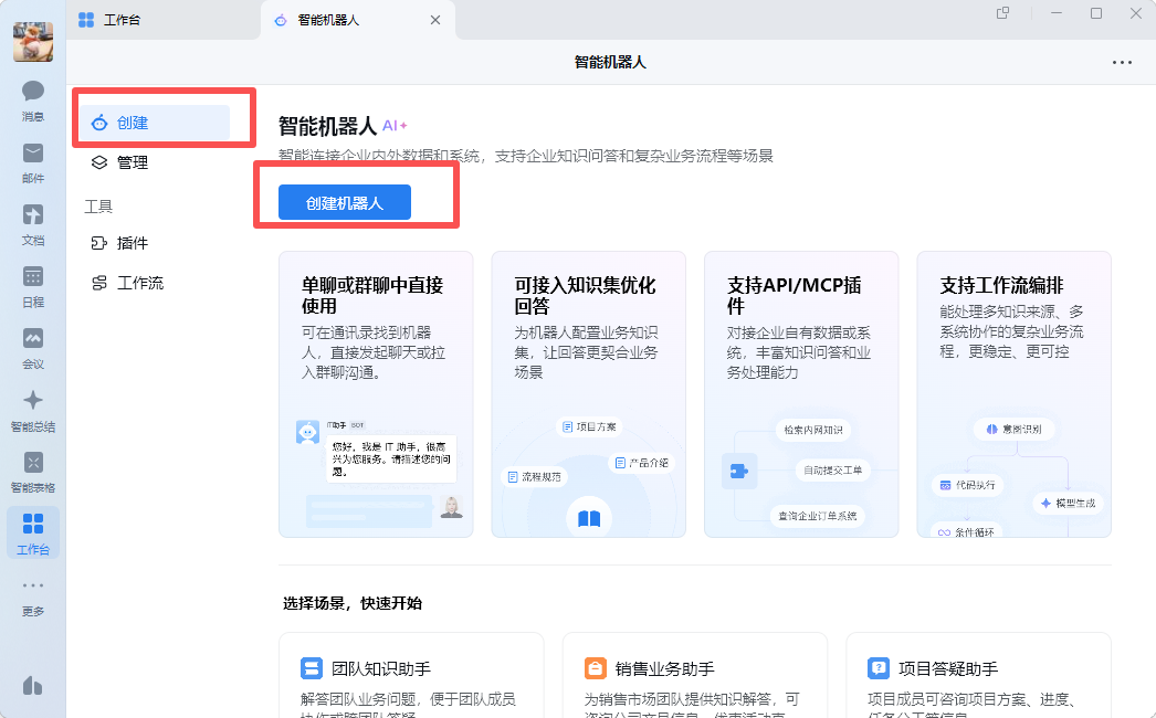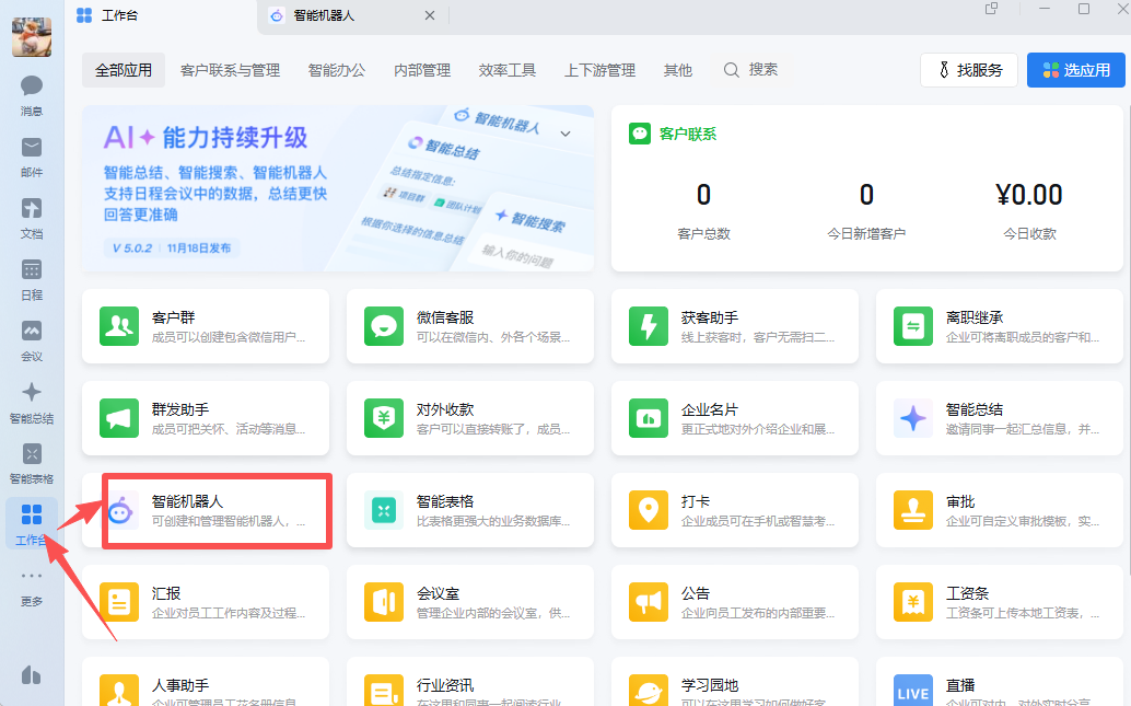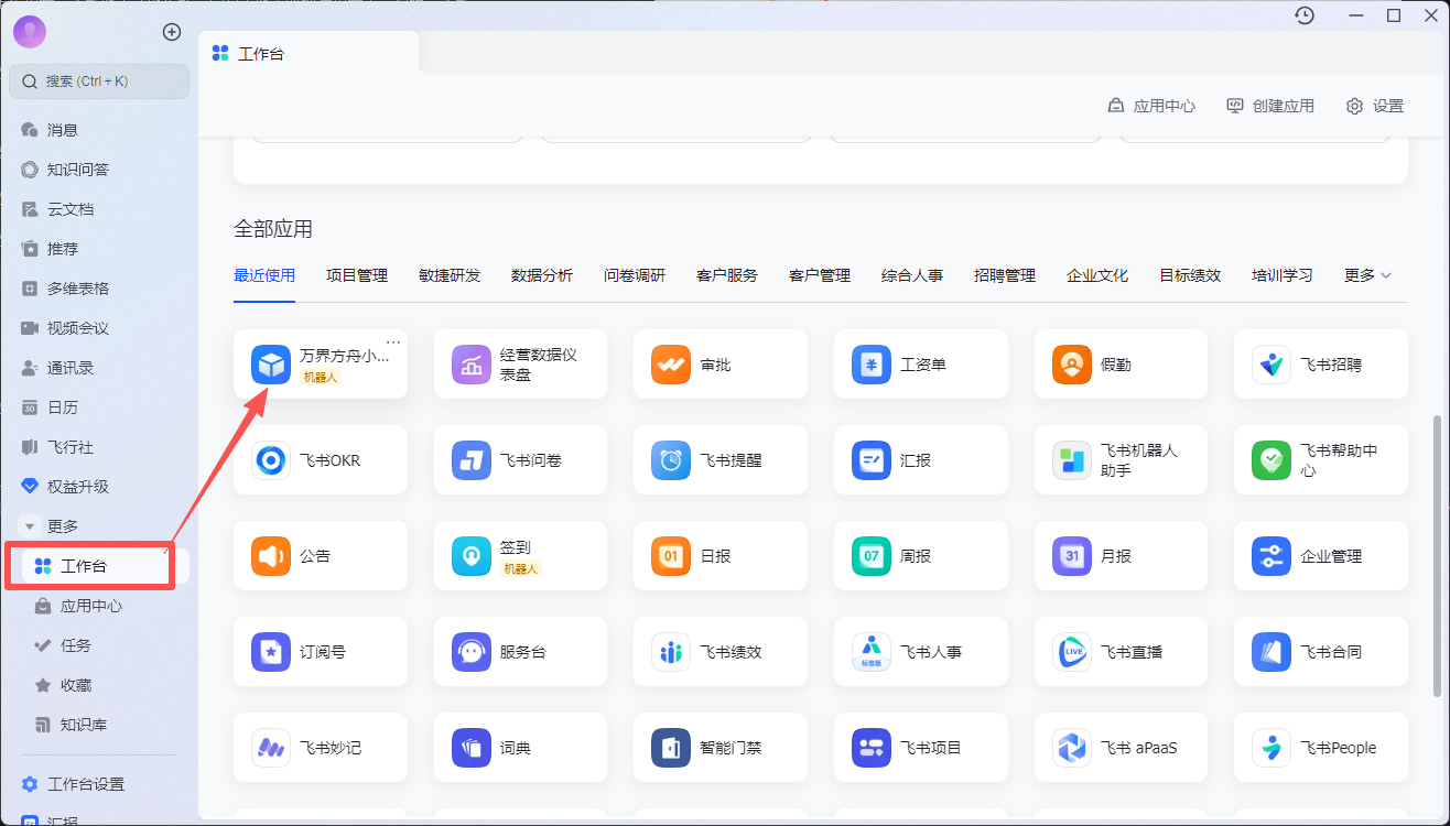 配置完成并重启后,打开飞书,进入工作台并选择机器人
