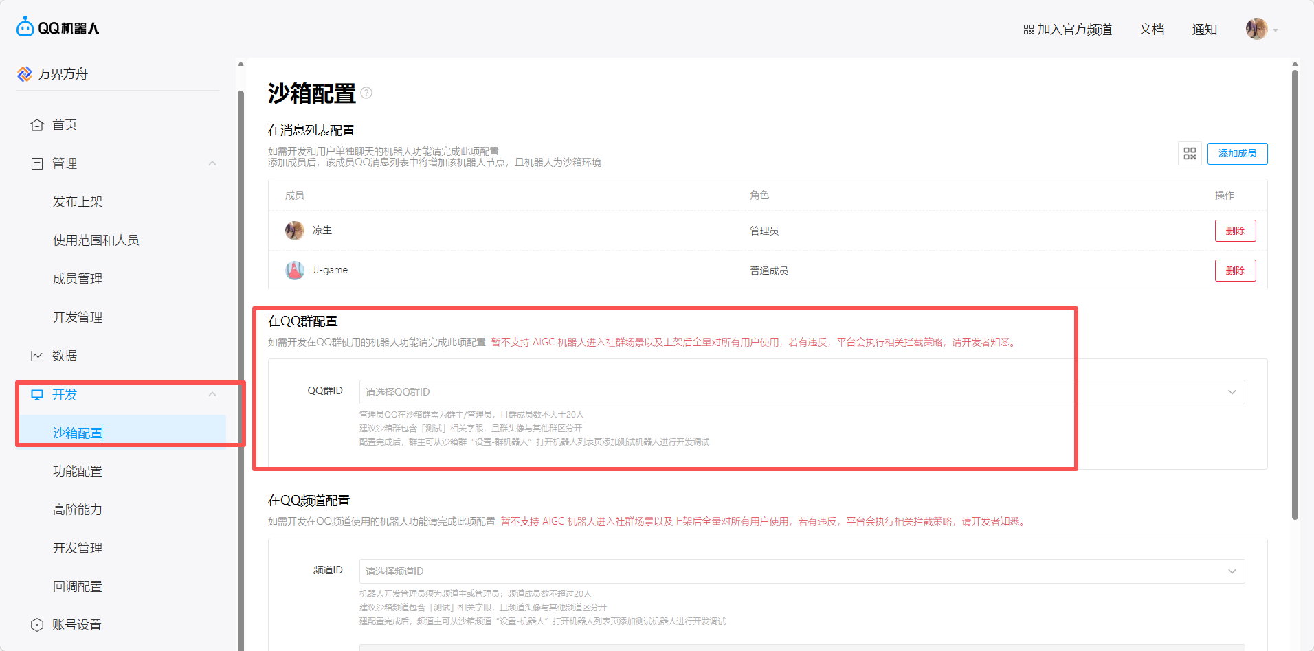 注意:官方规定自行配置的机器人(如小龙虾)暂无法在频道和 QQ 群中使用,具体公告参考 QQ 官方;如需 QQ 群配置,待官方放开后前往沙箱配置即可