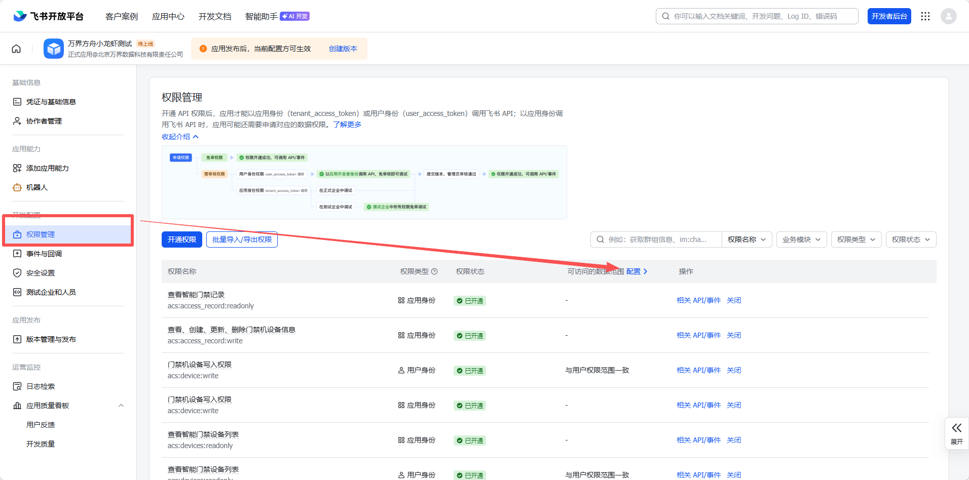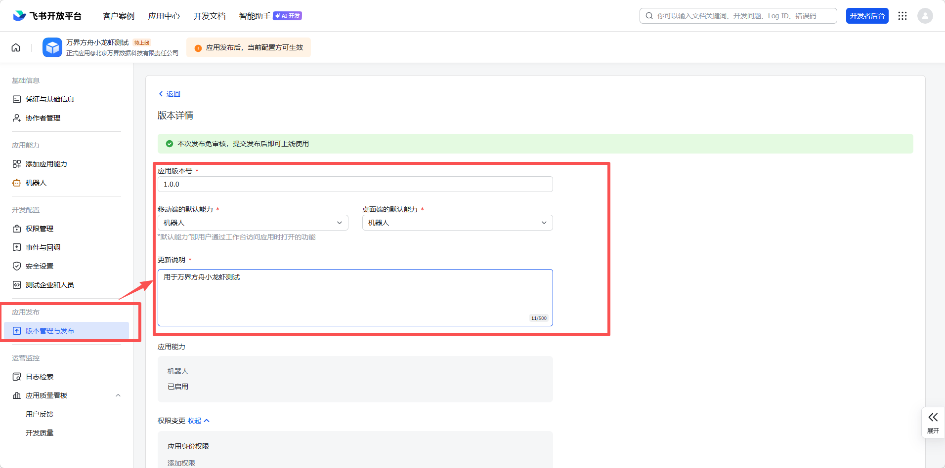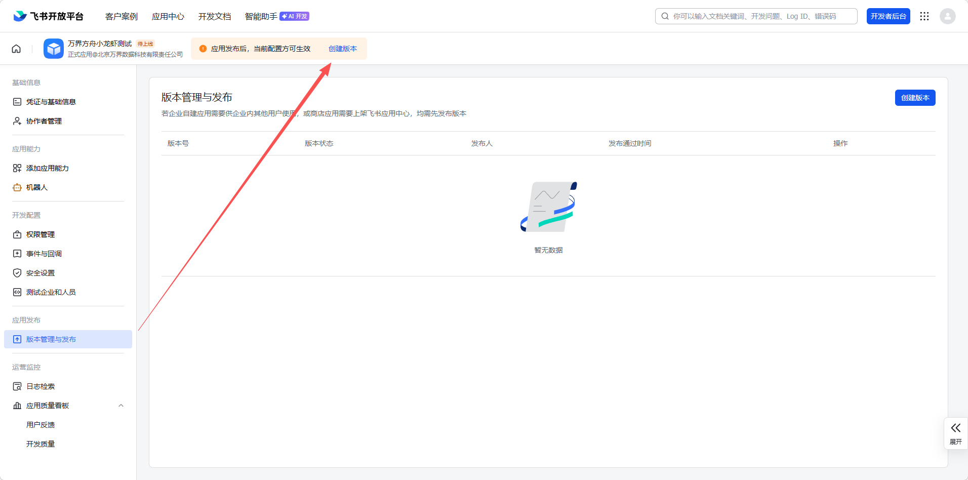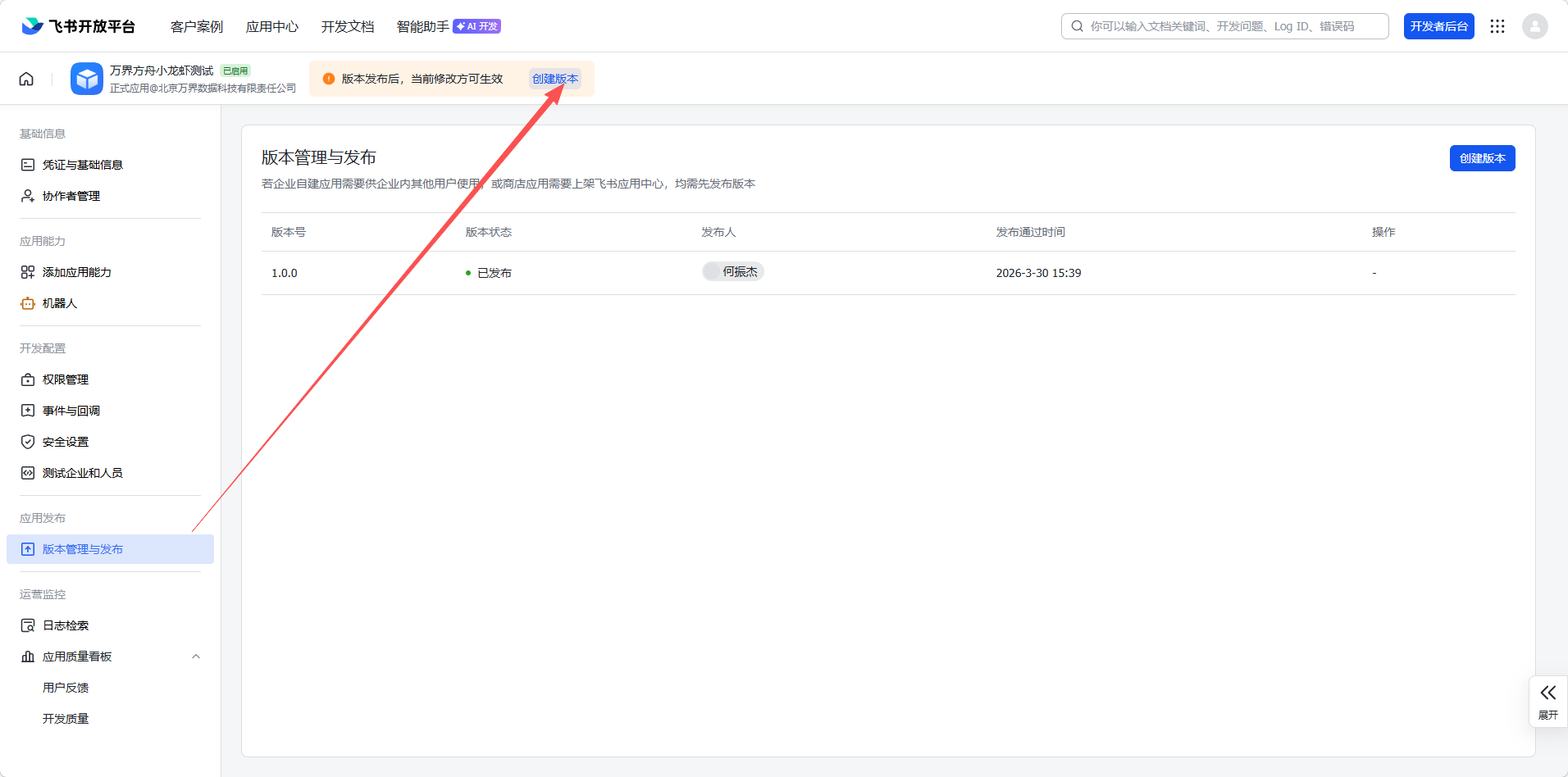 权限和事件都配置好了,需要再次发布一个新版本才能生效。回到「版本管理与发布」,创建一个新版本(如 1.0.1)并发布