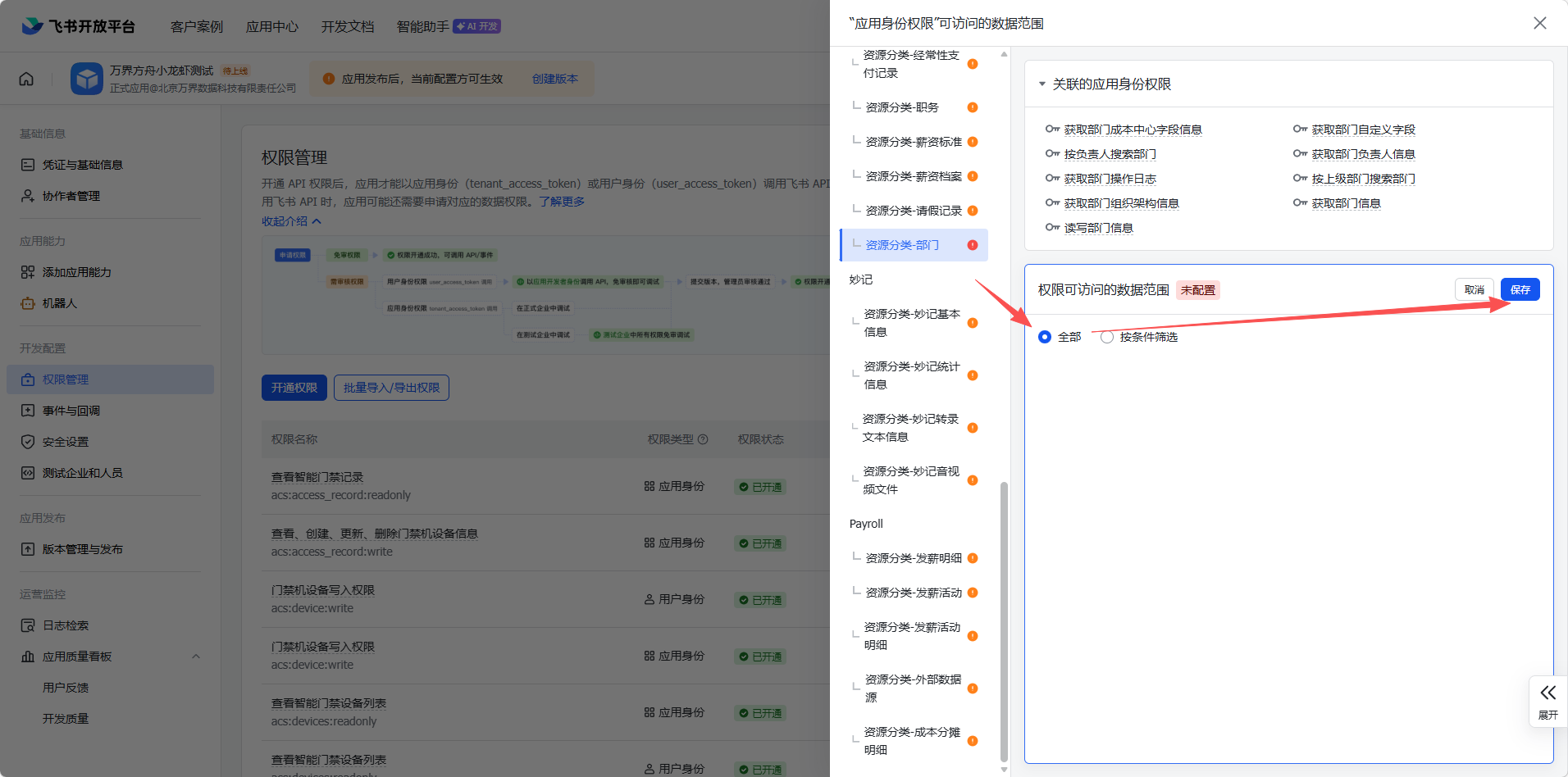 回到刚才那个企业微信创建机器人的页面,设置好你的可见范围,然后点保存