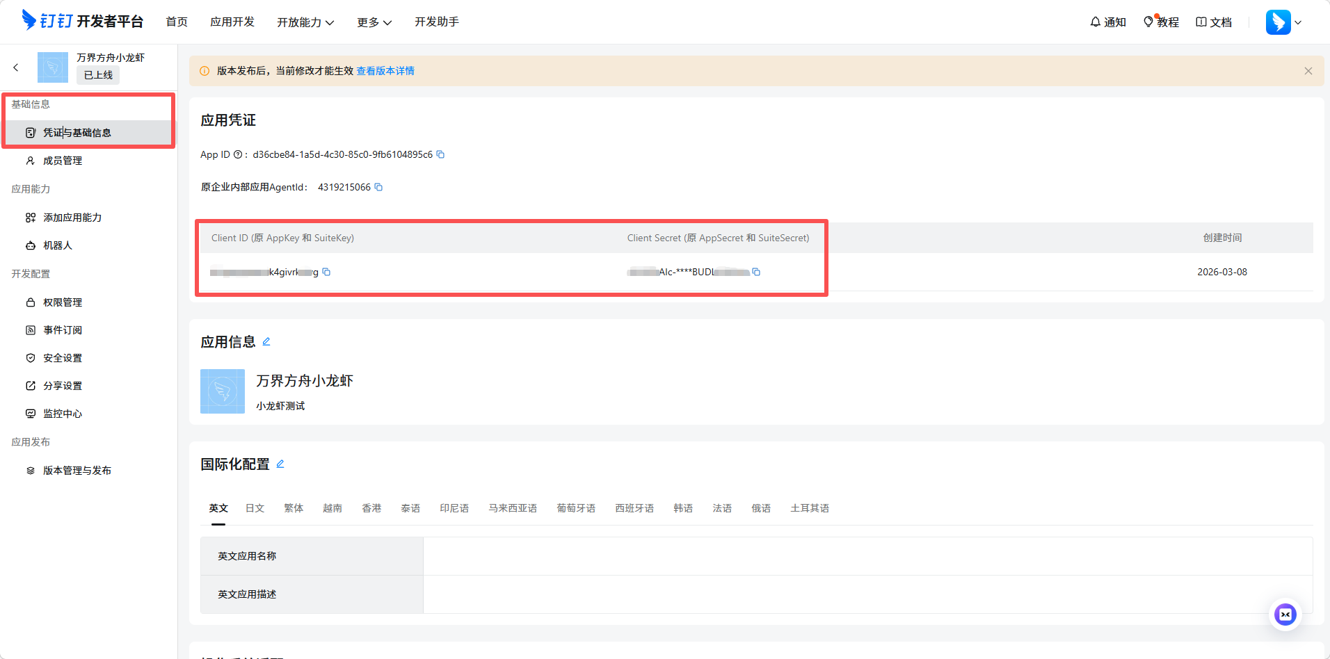 在左侧菜单选择凭证与基础信息,复制钉钉应用的Client ID和Client Secret。