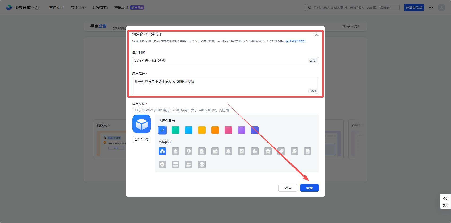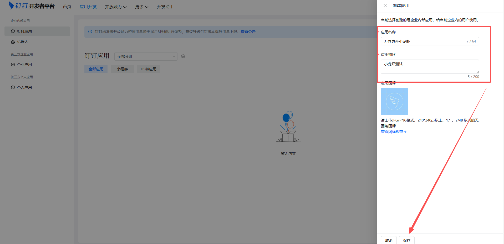 在创建应用面板,填写应用名称和应用描述,在应用图标上传图标,完成后点击保存。