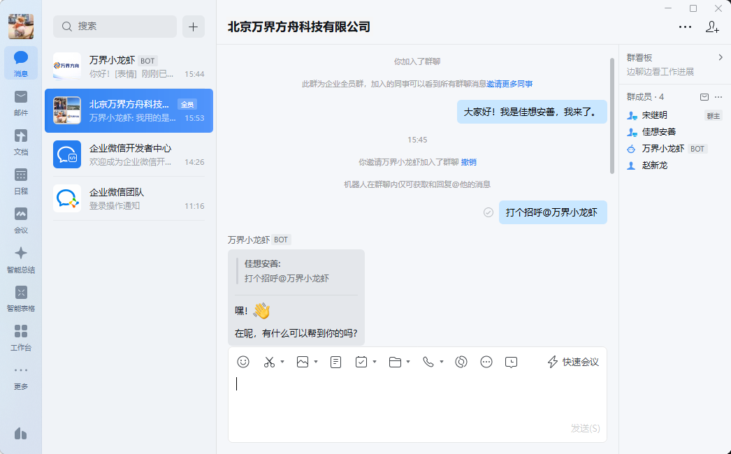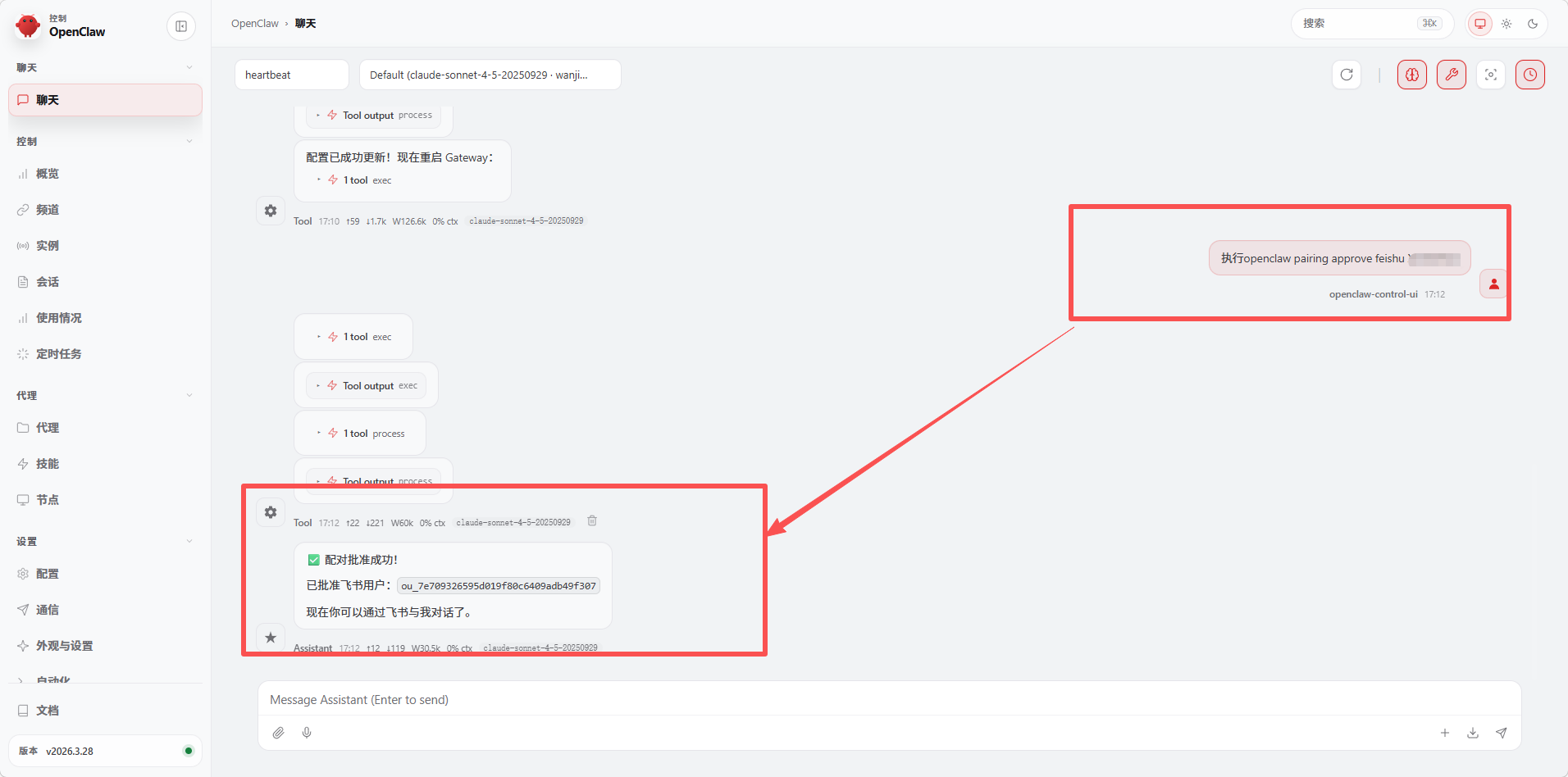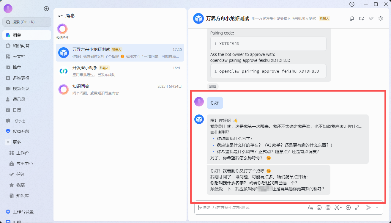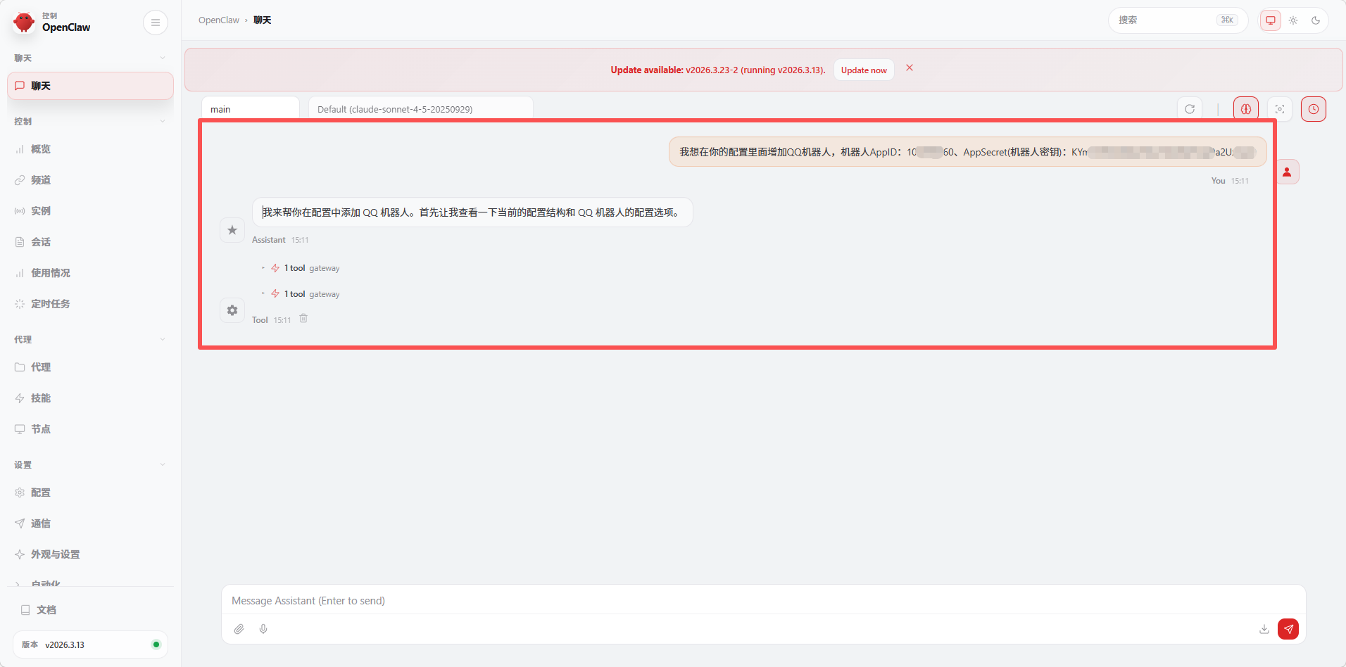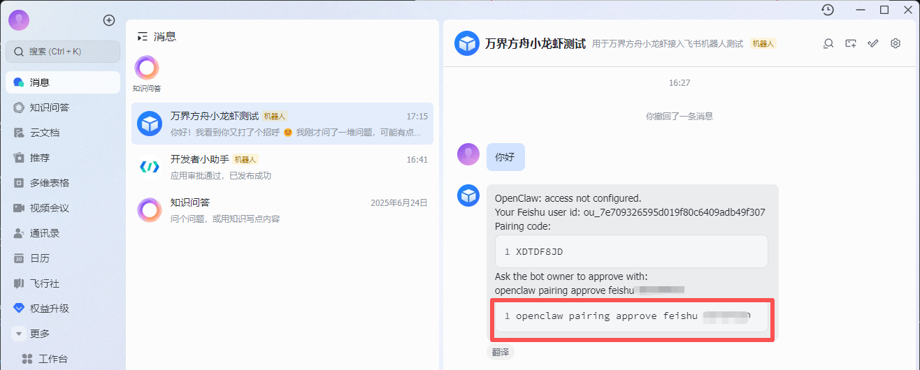 将拿到的 AppID(机器人 ID)和 AppSecret (机器人密钥)一并发送给 OpenClaw ,稍等片刻配置完成