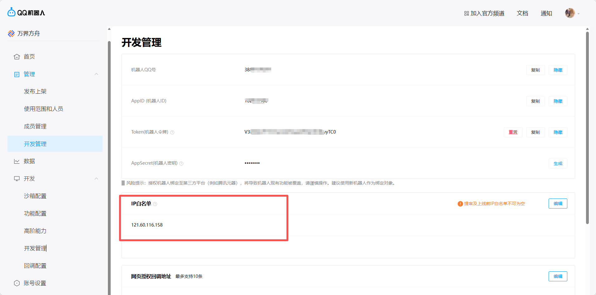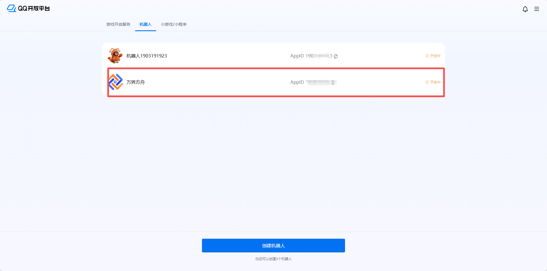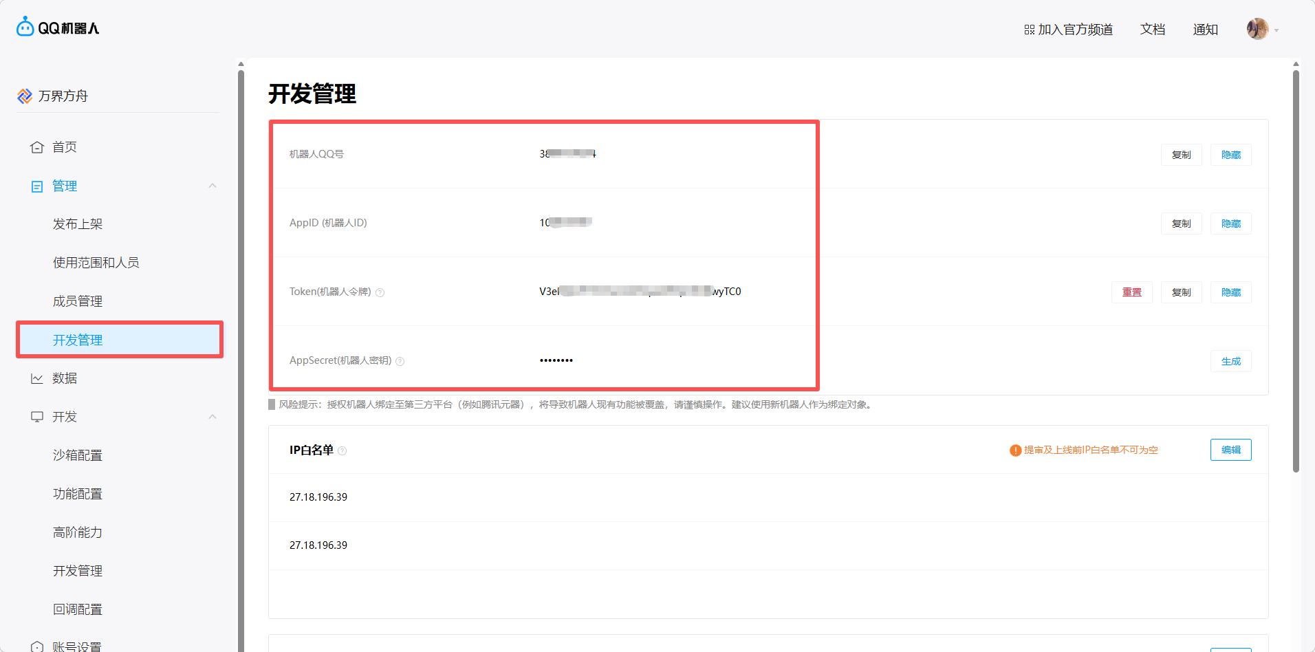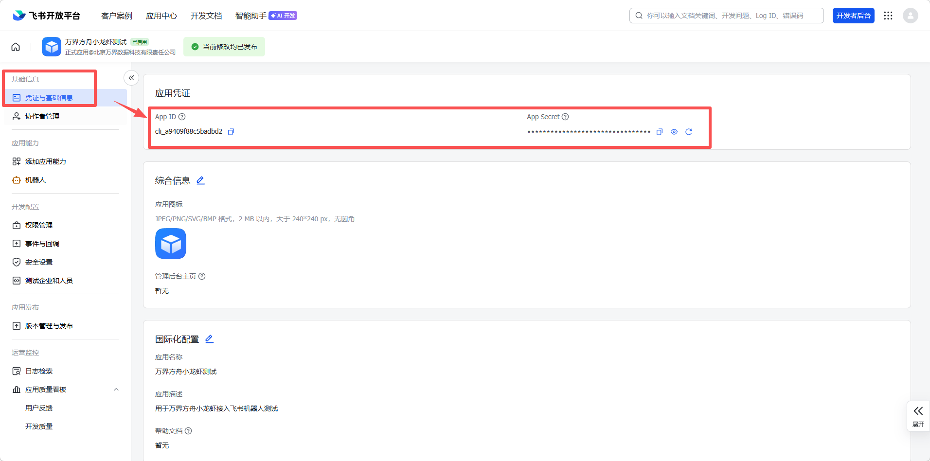 点击已创建机器人,进入开发管理拿到 AppID(机器人 ID)和 AppSecret (机器人密钥)