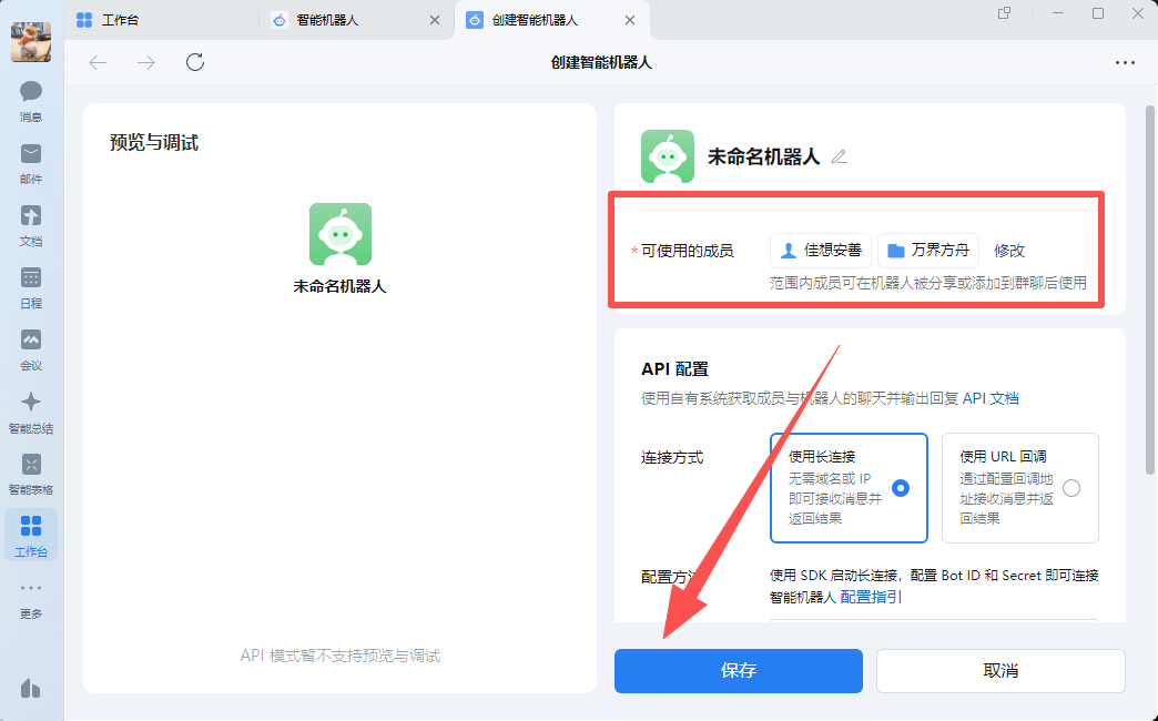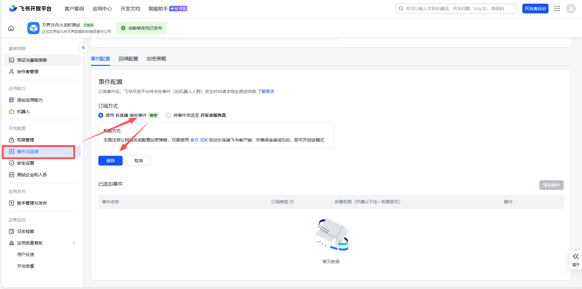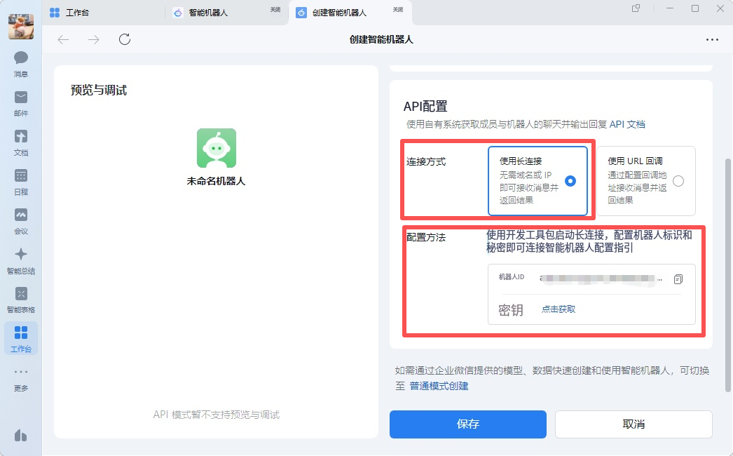 API 配置中连接方式选择使用长连接,获取密钥和机器人 ID,这个界面保持暂时不要关闭