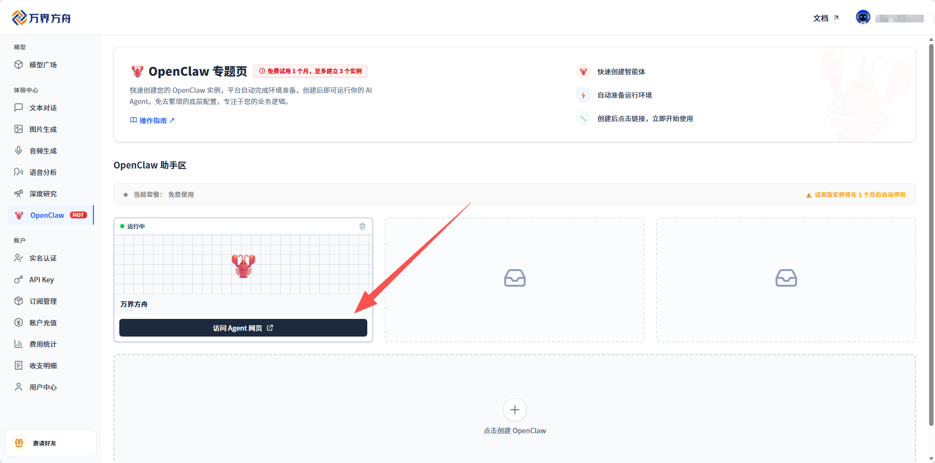 当前通过万界方舟创建 OpenClaw 实例为限时免费。实例运行过程中产生的费用,将按照所调用模型的计费标准收取。模型计费标准请访问万界方舟模型广场了解模型详情