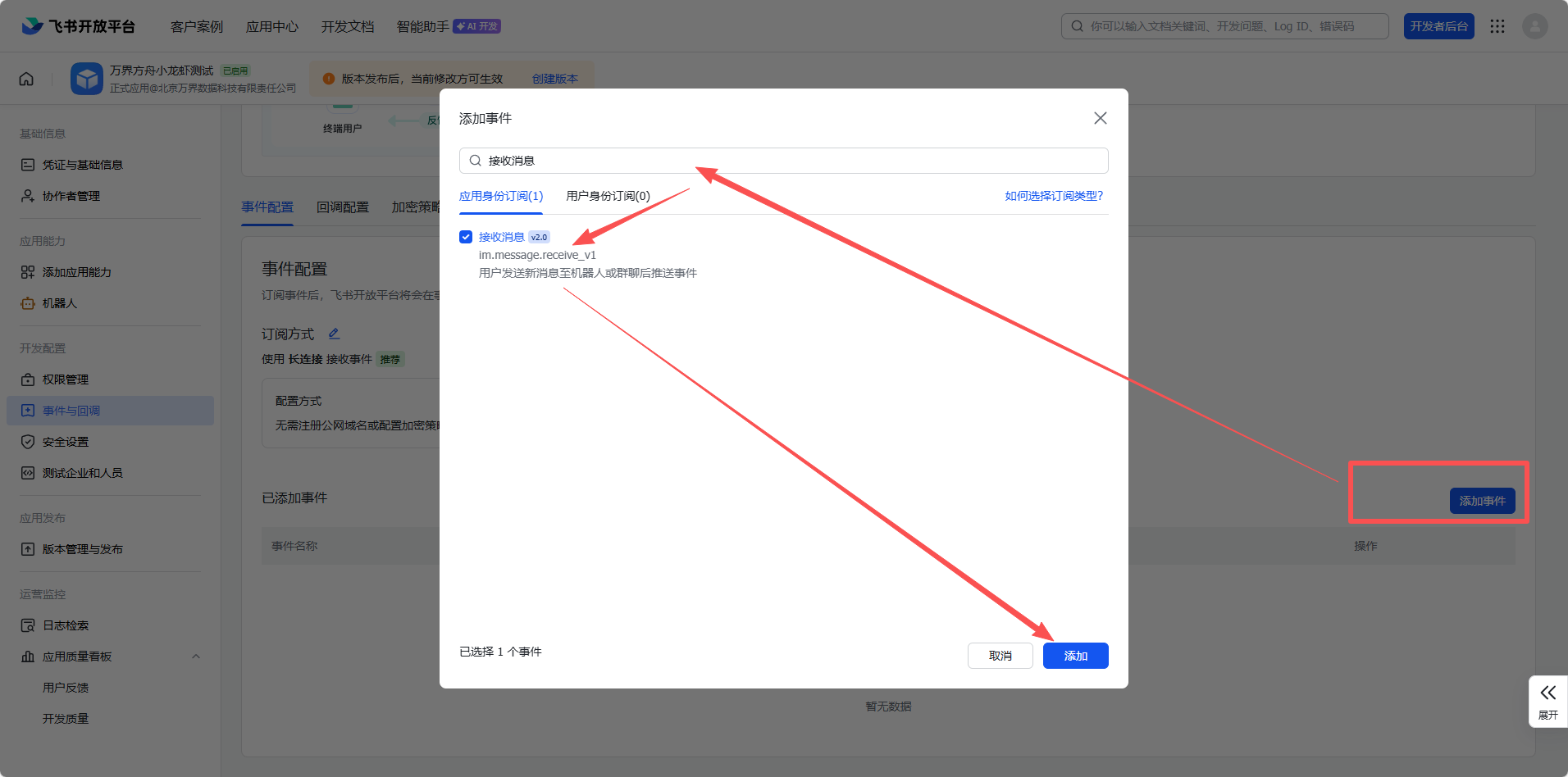 点击添加事件,搜索并选择接收消息事件(im.message.receive_v1),然后点击「确认添加」