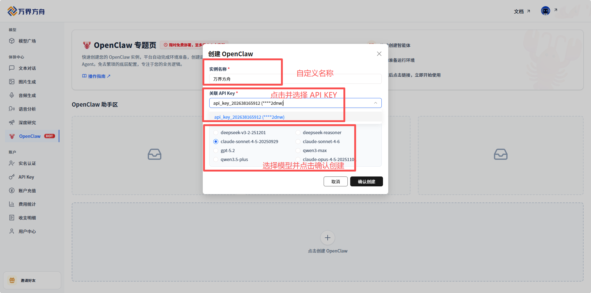 进入 OpenClaw 专题页,点击创建 OpenClaw,自定义示例名称,点击并下拉选择关联 API Key后选择配置支持的模型并点击创建