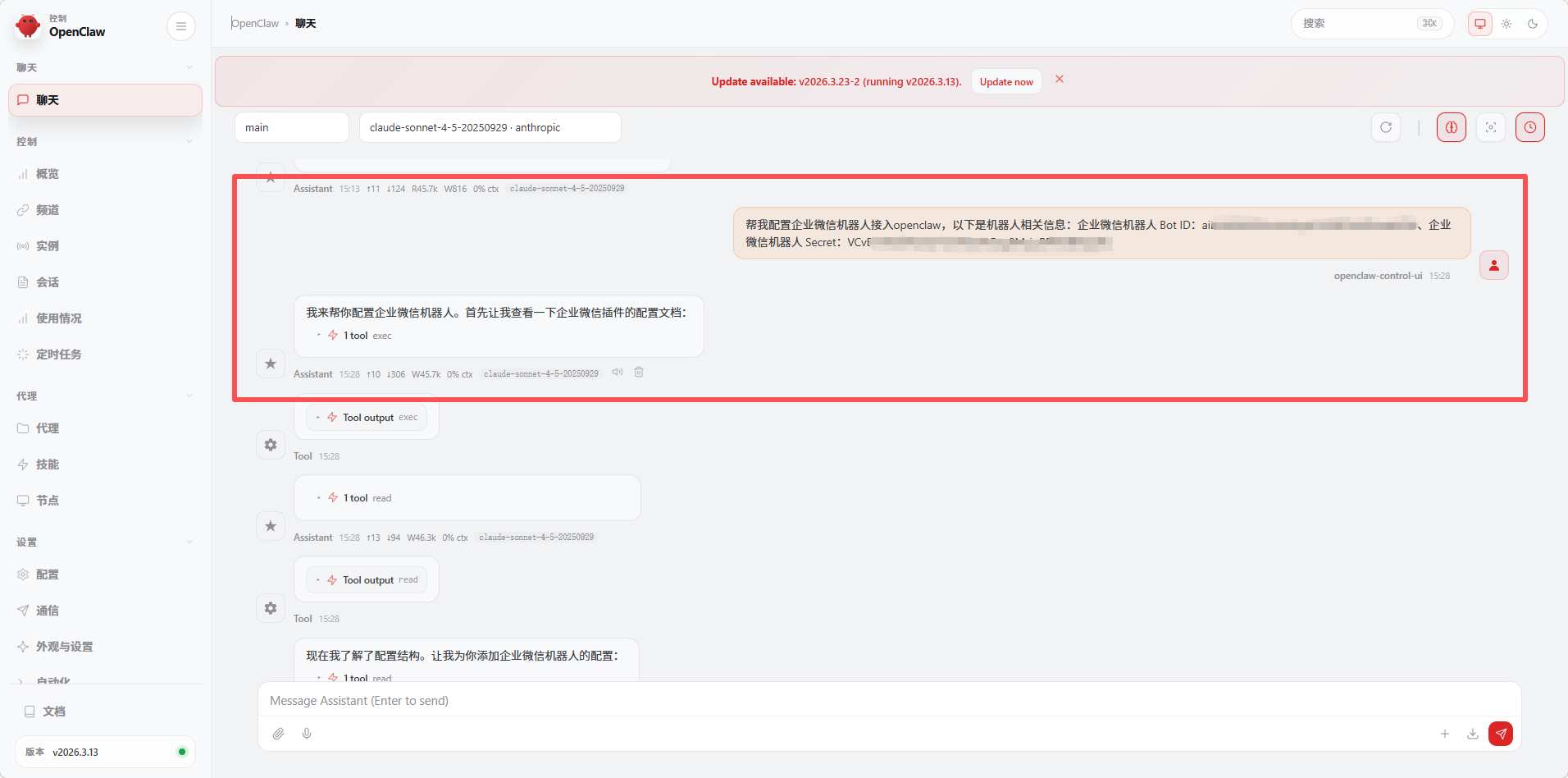 将密钥和机器人 ID 交给 OpenClaw,稍等片刻配置完成