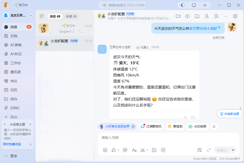 在钉钉群中@机器人进行交流互动。也可以在钉钉的搜索栏中,输入机器人名称后,在功能页检索到对应机器人,进行私聊互动。