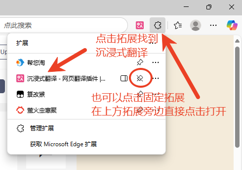 - 打开浏览器,访问需要翻译的网页或电子书等多语言内容,点击 拓展--沉浸式翻译,也可以先把沉浸式翻译固定到拓展,在上面菜单栏直接点击打开。