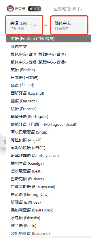 - 选择需要翻译的语言类型(默认为自动检测)和目标语言。
