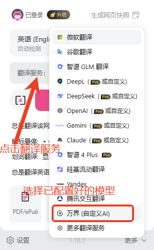 - 打开沉浸式翻译,点击翻译服务,选择已配置好的模型,其中AI专家级别可以根据实际需求自行选择。