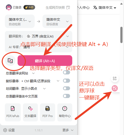 Alt+W: 翻译整个页面,而不是默认的智能翻译内容区域。