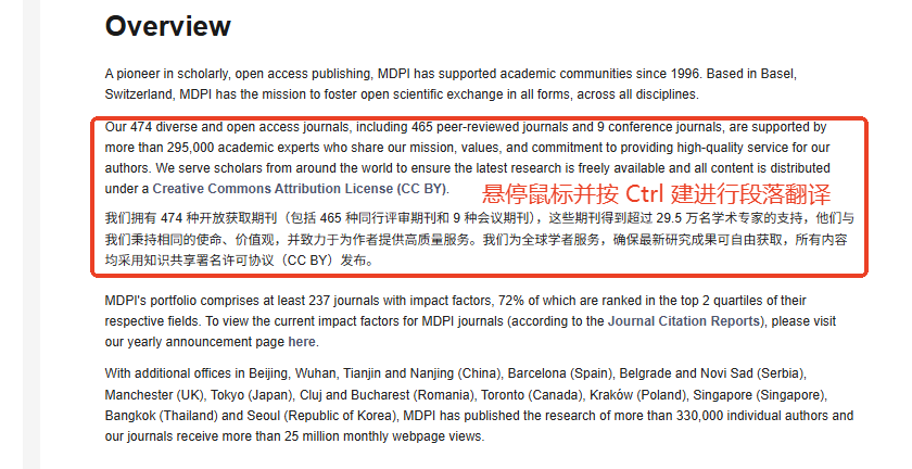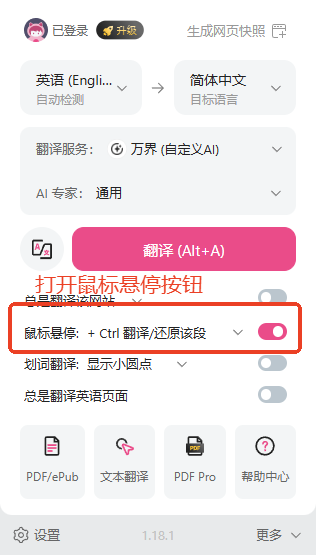 - 如果需要翻译网页中某一段文字。打开沉浸式翻译拓展,打开鼠标悬停:+ Ctrl 翻译/还原该段,回到想要翻译的网页,将鼠标悬停在需要翻译的文字上,按一下 Ctrl 键实现段落翻译。