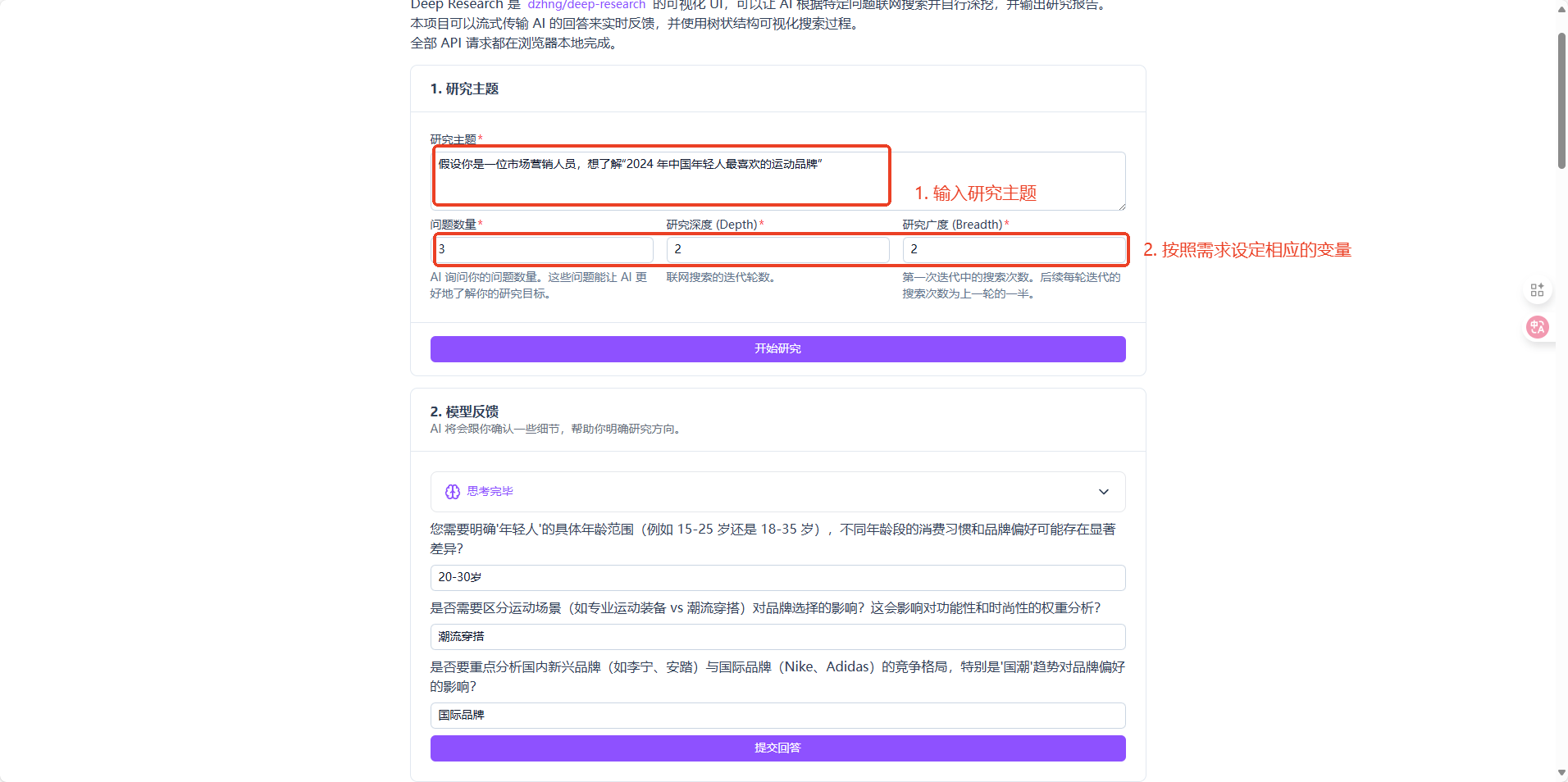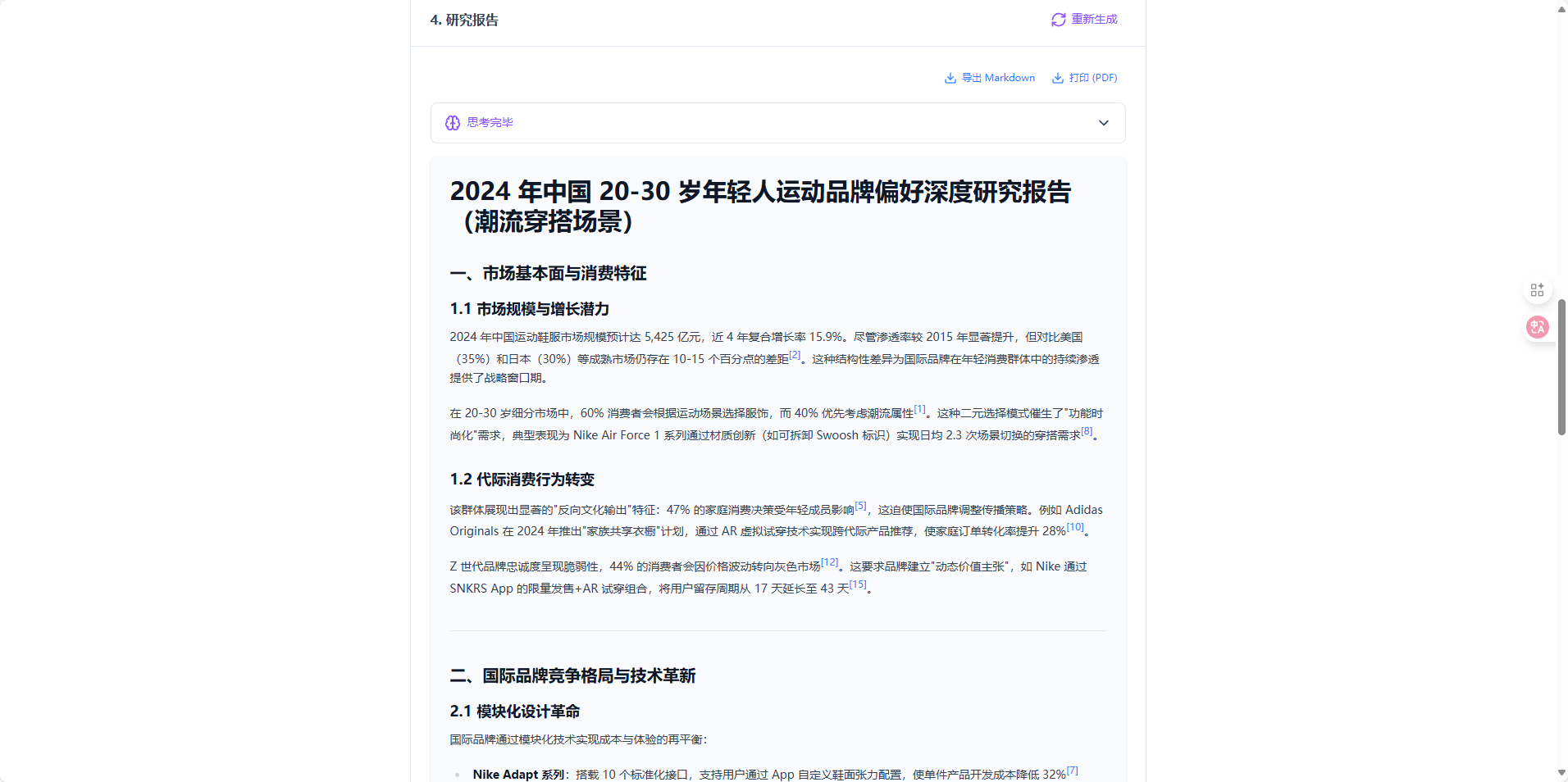 - 打开Deep Research 官网,在研究主题中输入感兴趣的方向,并给 AI 增加假定条件和背景,如:假设你是一位市场营销人员,想了解“2024 年中国年轻人最喜欢的运动品牌”