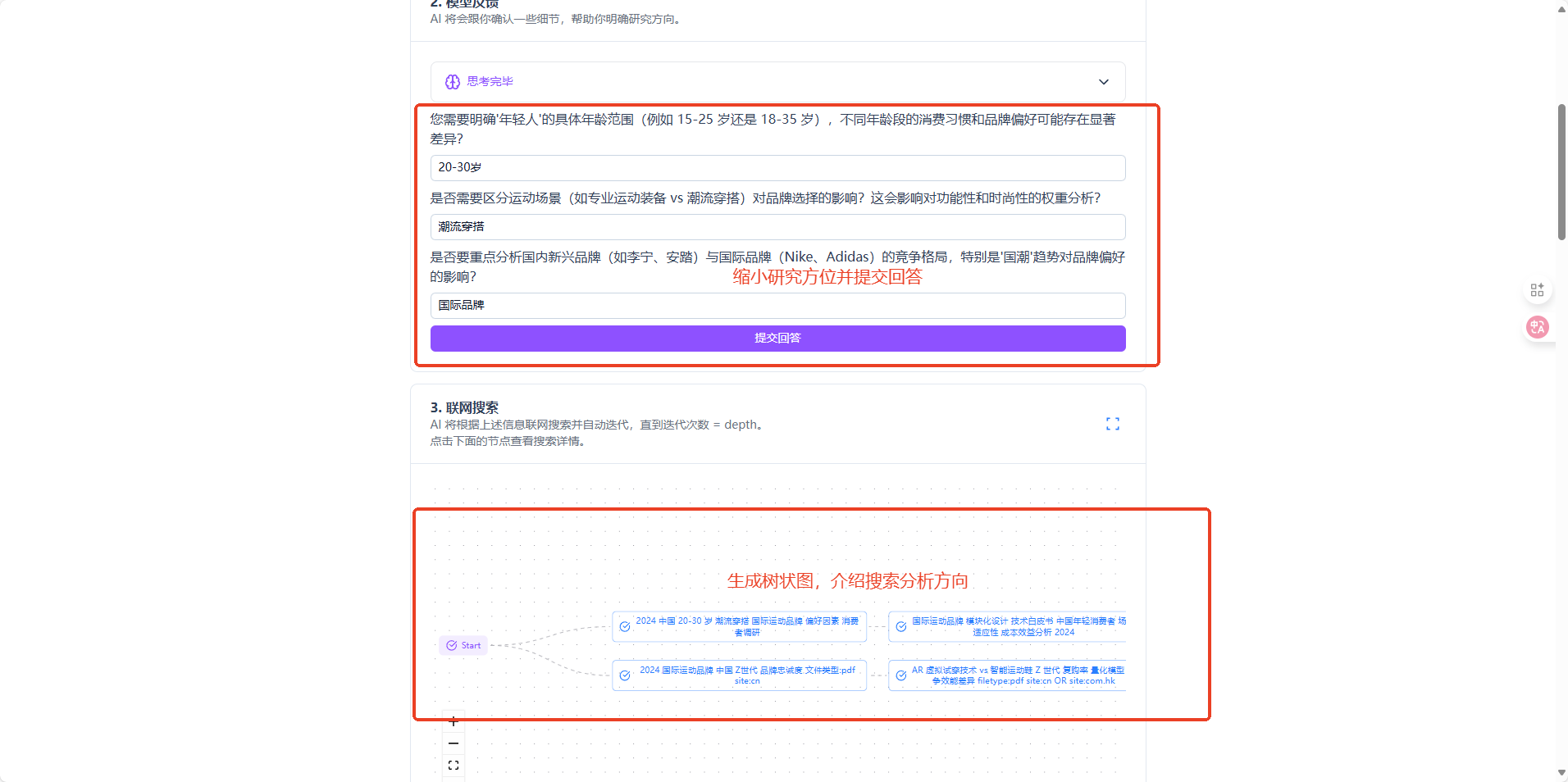 - 点击开始研究后,Deep Research 会进行一段时间思考并想要缩小搜索范围,更细化研究方向。