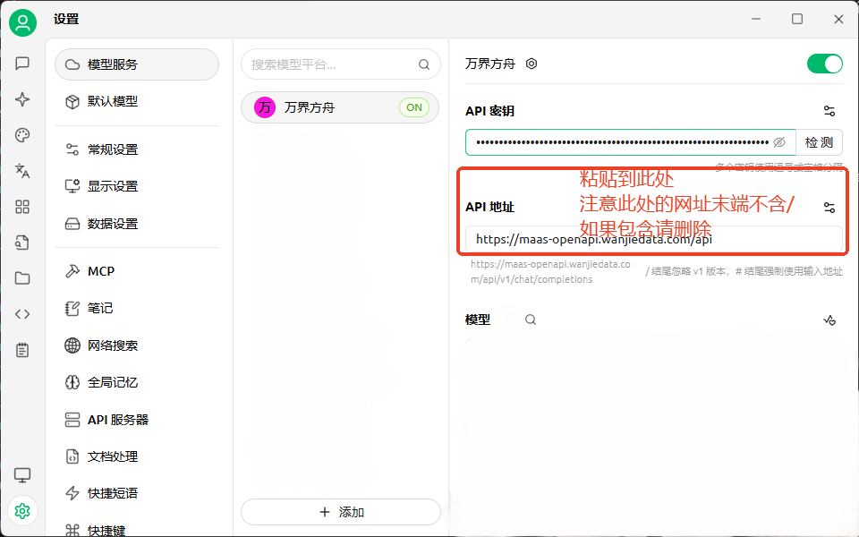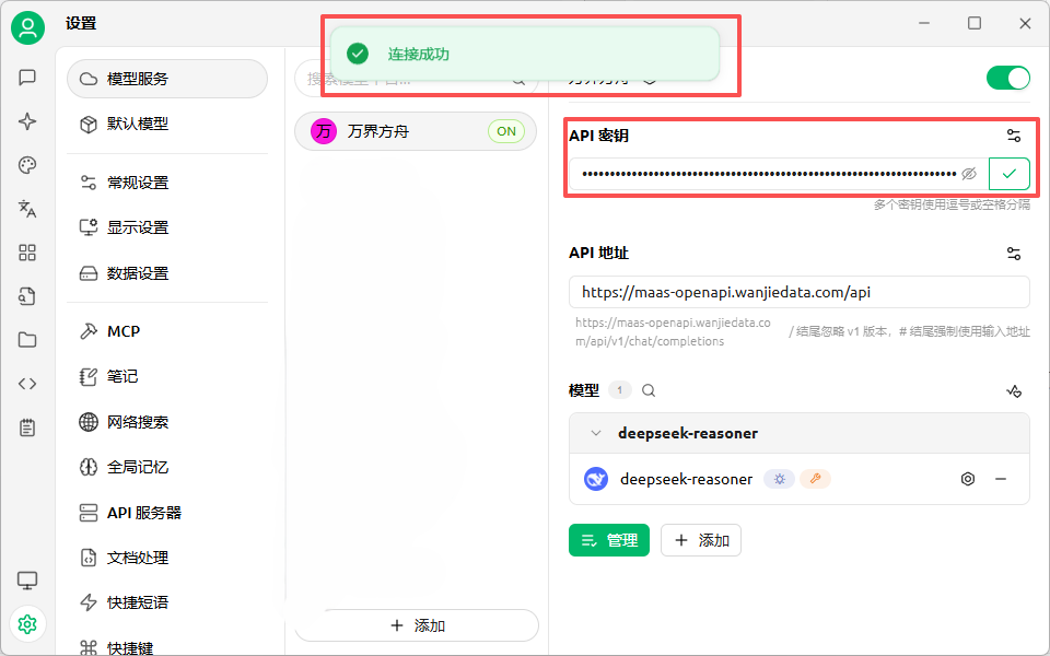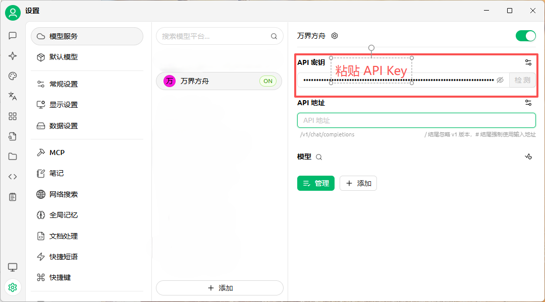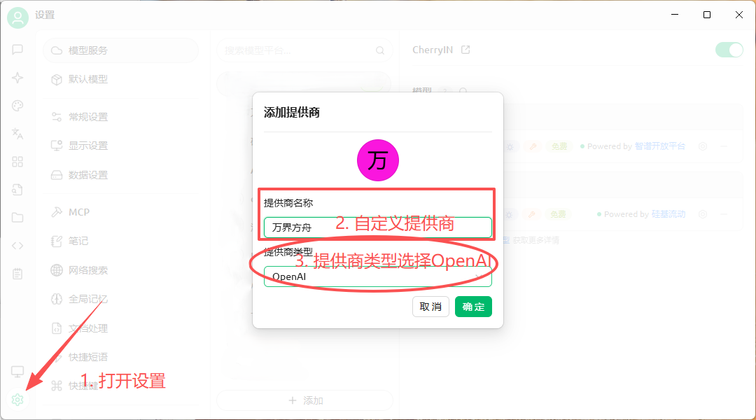 - 打开 Cherry Studio,点击设置并找到模型服务,点击界面下方的添加按钮,搜索“万界方舟”进行添加,供应商类型选择 OpenAI,将 API Key 粘贴到 API 密钥中。