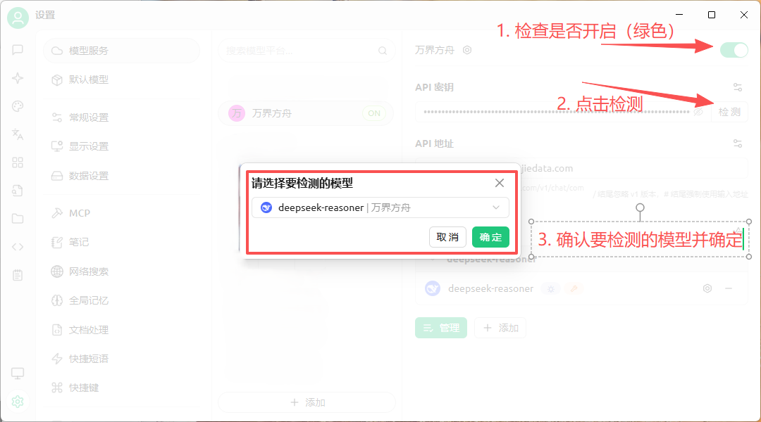 - 确保右上角绿色开启状态,点击检测,出现连接成功进行下一步。