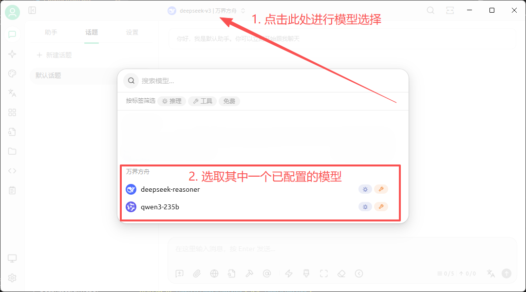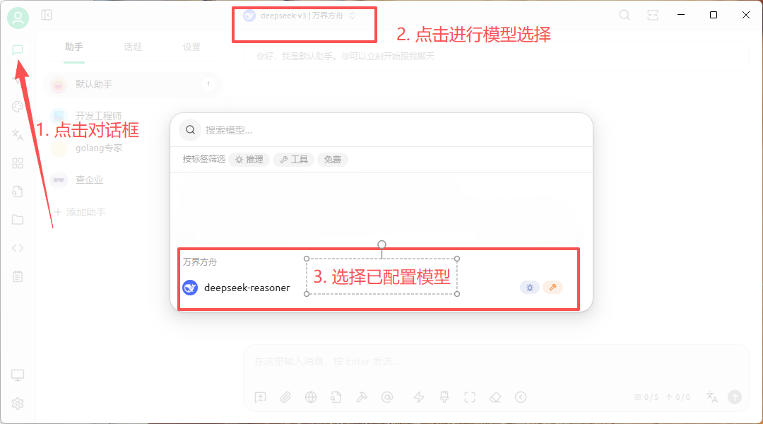 - 选择助手,在该界面上方可以看到我们搭建好的模型,点击进行选择(注意选择单个模型,以免出现 API 错误导致无法使用)。