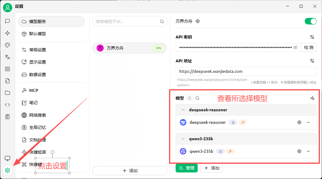 选择设置--模型,这里可以看到教程里面安装好的模型。为了更直观展示,这里设置了两个不同的模型,可根据实际需求进行更改。
