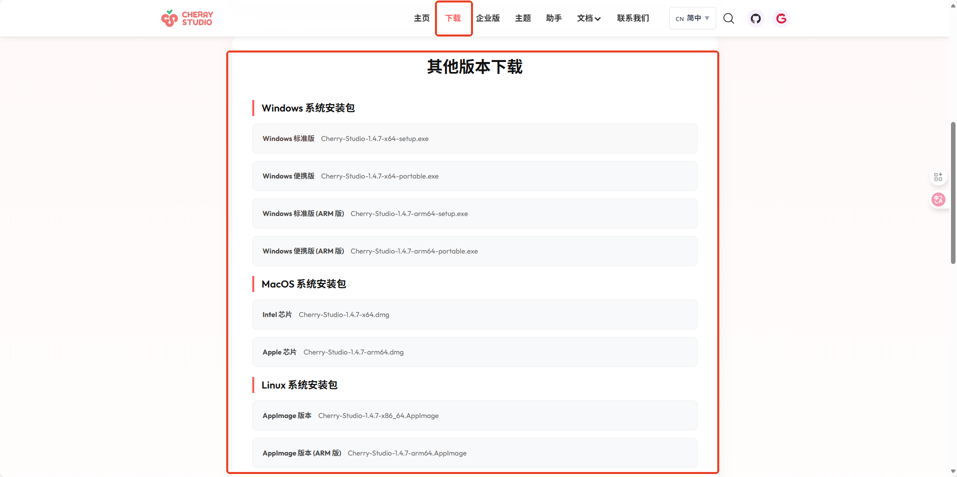 - 在 Cherry Studio 官网中选择合适的版本下载并根据提示进行安装。如您已安装,请跳过本步骤。