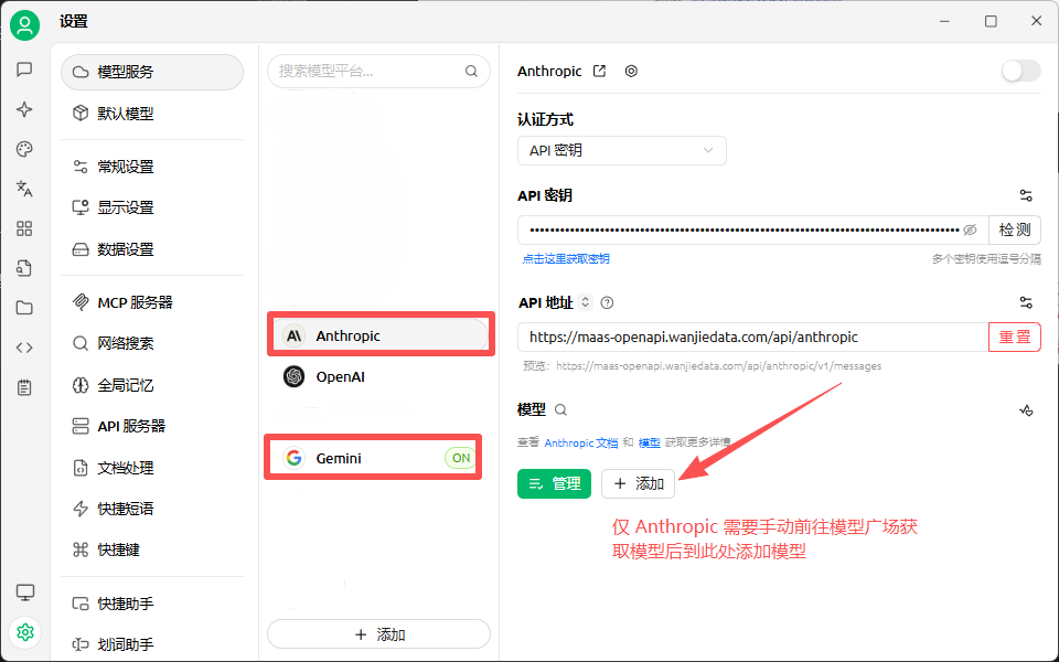 说明:Cherry Studio 同时适用 Gemini、Anthropic 端侧支持模型,只需要将模型服务选择 Gemini 或 Anthropic 并粘贴相应的 URL 到 API 地址中即可,其他步骤与本文介绍一致