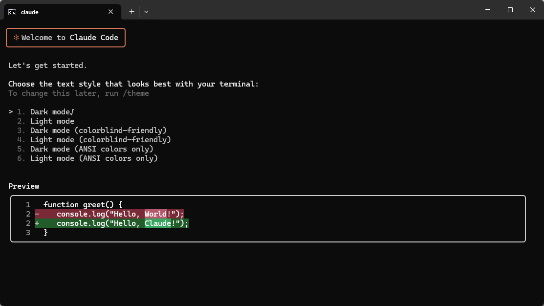 第一次运行时,welcome 界面会让您选择不同界面风格,这里可以根据个人喜欢的风格进行选择,我这里选择的默认第一个(键盘上下键选择、回车 enter 键确认)