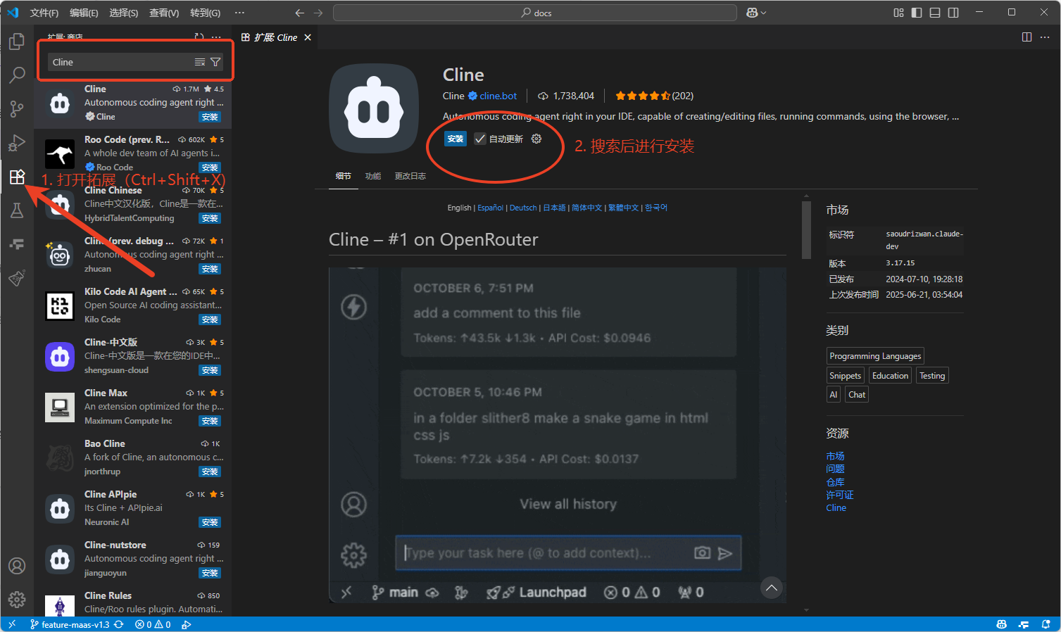 - 在 VScode 中,左侧菜单栏找到扩展选项(或使用 Ctrl+Shift+X 快捷键),搜索 cline 并安装。
