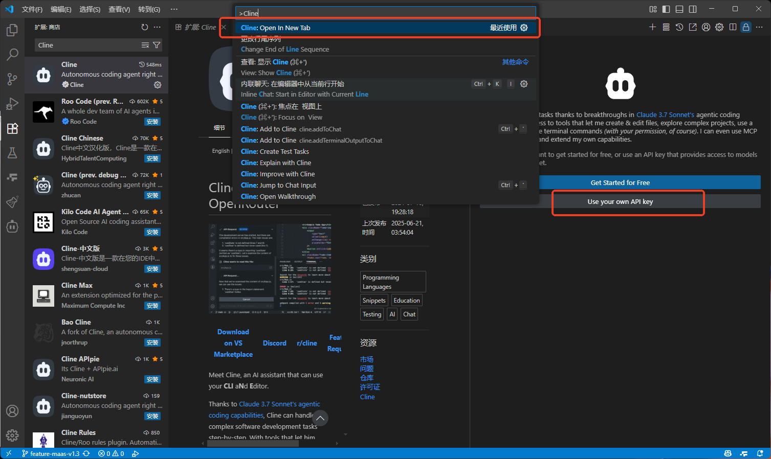 - 安装成功后,使用快捷键 Ctrl+Shift+P 打开命令面板,输入 Cline 并选择 Cline:Open In New Tab 命令,点击 Use your own API key 按钮。