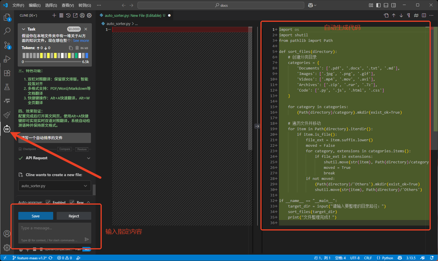 重启 VScode 后,在 VScode 左侧找到 cline 图标,点击进入 cline 界面,输入你想让它做的代码并进行编译。