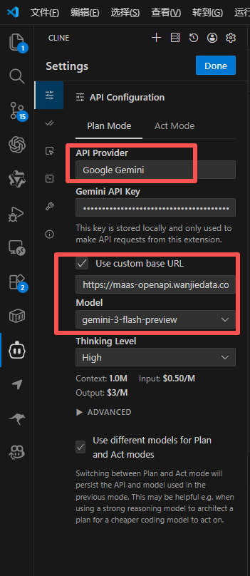 说明:Cline 同时适用 Google Gemini、Anthropic 端侧支持模型,只需要将 API Peovider 修改为 Google Gemini 或 Anthropic 并勾选Use custom base URL并粘贴相应的 URL 即可,其他步骤与本文介绍一致