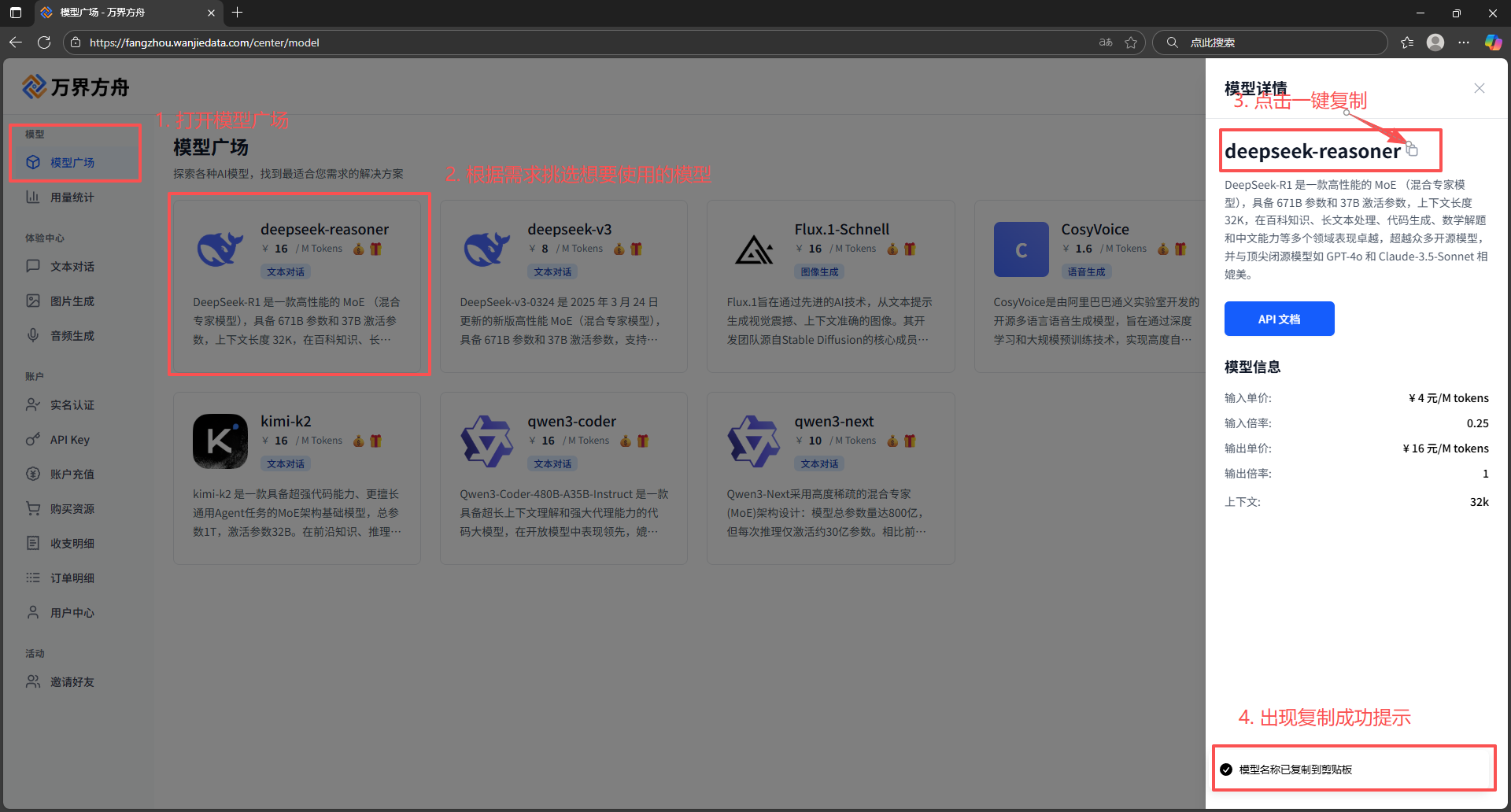 - 进入万界方舟 API Key ,找到 API KEY 点击一键复制按钮,待上方出现复制成功提示词。