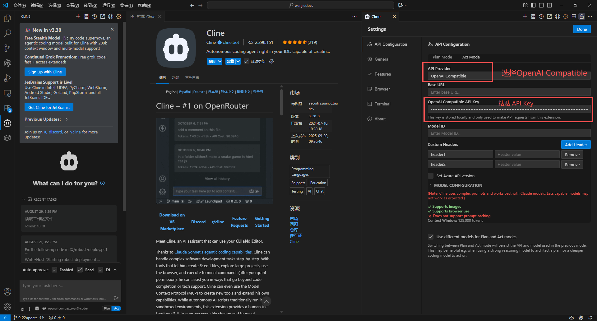 - 回到 VScode,在“ API Provider ”中选择“ OpenAI Compatible ”,将复制的 APIKEY 粘贴到 API Key 输入框中。