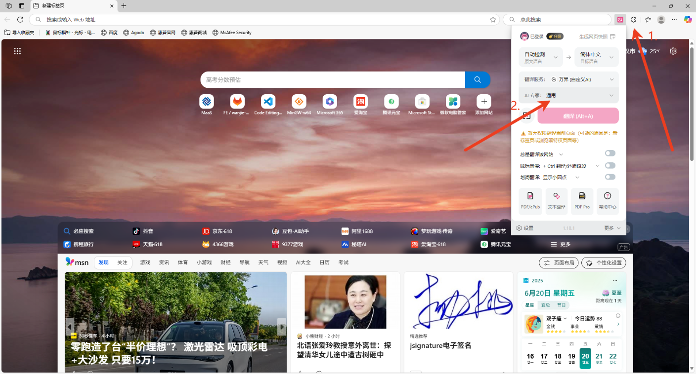 - 打开浏览器,点击拓展--沉浸式翻译--翻译服务--万界方舟(自定义 AI ),AI 专家级别可以根据实际需求自行选择。