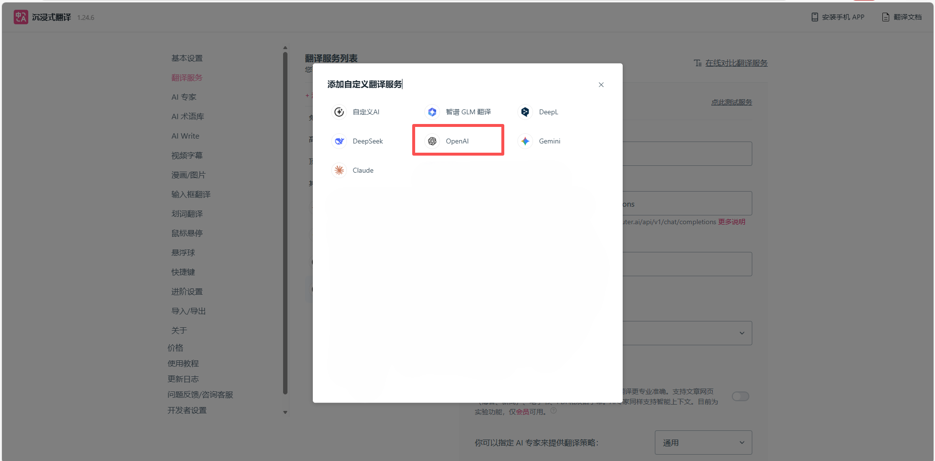 打开设置页后点击“翻译服务”,点击添加自定义翻译服务,可选 Claude 或 Gemini,并在自定义 API 接口地址填入对应的 URL: