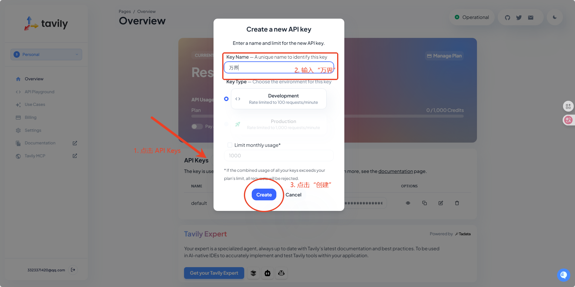 - 点击 Deep Research 设置下方链接:https://app.tavily.com/home 进行注册登录后点击API Keys--Key Name中输入“万界”--点击 create。