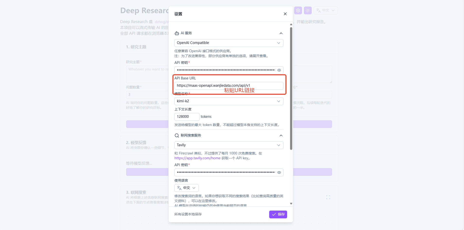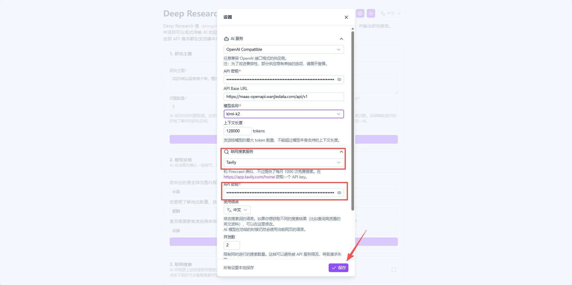- 点击刚才创建的 API Key 进行复制,并粘贴到 Deep Research 的第二个 API 密钥中,点击保存即可使用。