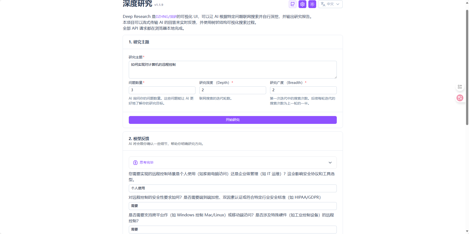 Deep Research Web UI 力求降低操作门槛,你可以在研究方向输入你想要分析的文本数据或问题,模型反馈中给Deep Research Web UI增加你的具体需求,只需要耐心等待即可获得你想要的答案。