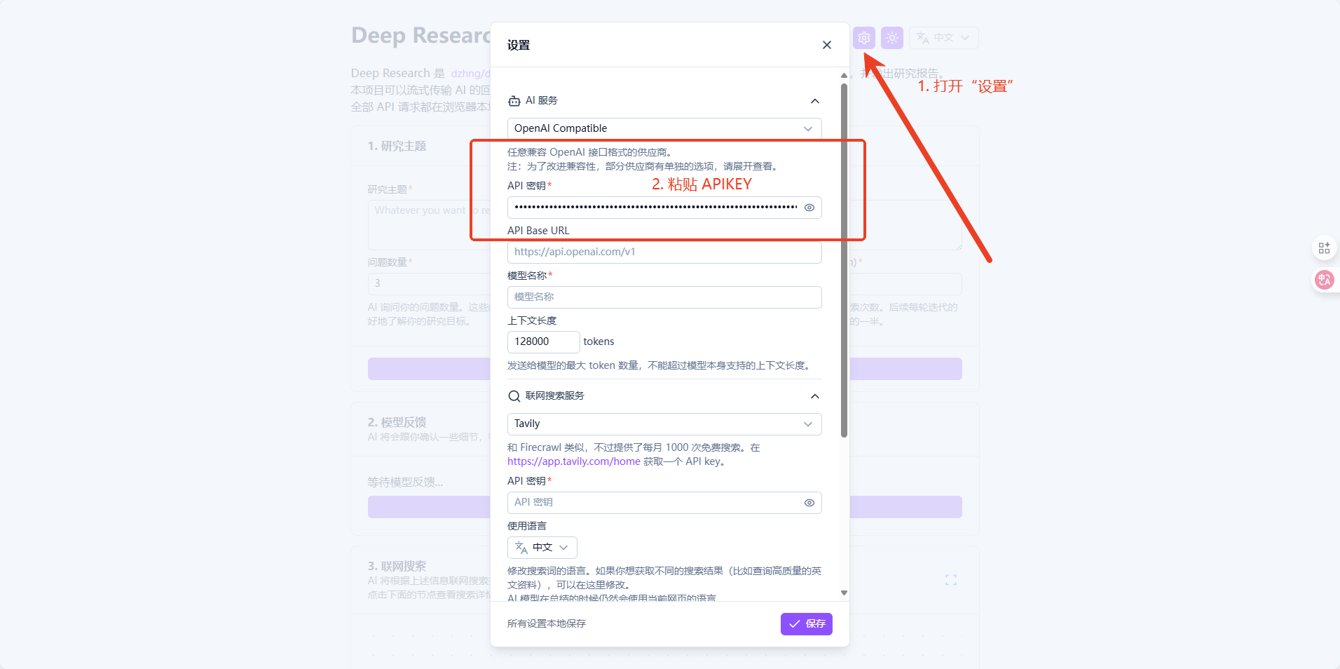 - 打开 Deep Research 官网 ,点击右上角设置图标,AI 服务选择OpenAI Compatible,并将刚才复制的 API 粘贴到第一个 API 密钥中。